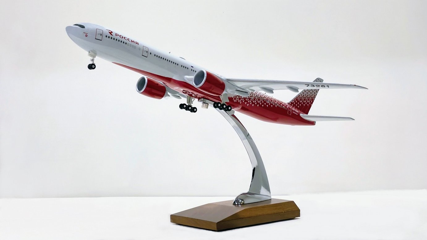 Модель вызывает положительные эмоции, хотя бы от того, что фирма Арсенал старается конкурировать с ведущими производителями моделей такого класса. После пустых недетализированных болванок к более менее качественным моделям типа этой, в которой присутствует приятная окраска, детальные прорезиненные шасси, огни и даже антенны( правда внизу не сделали, видимо боятся повреждения или по еще каким то причинам). Еще бы им поработать над двигателями, пока не крутятся. Ну в целом можно отметить модель 777 в окраске "России", очень даже понравилась. Поэтому взял с радостью и не сколько не пожалев, пополнив при этом коллекцию своих "трех топоров"