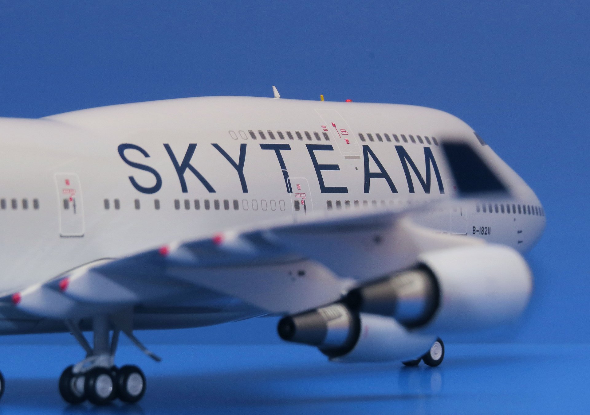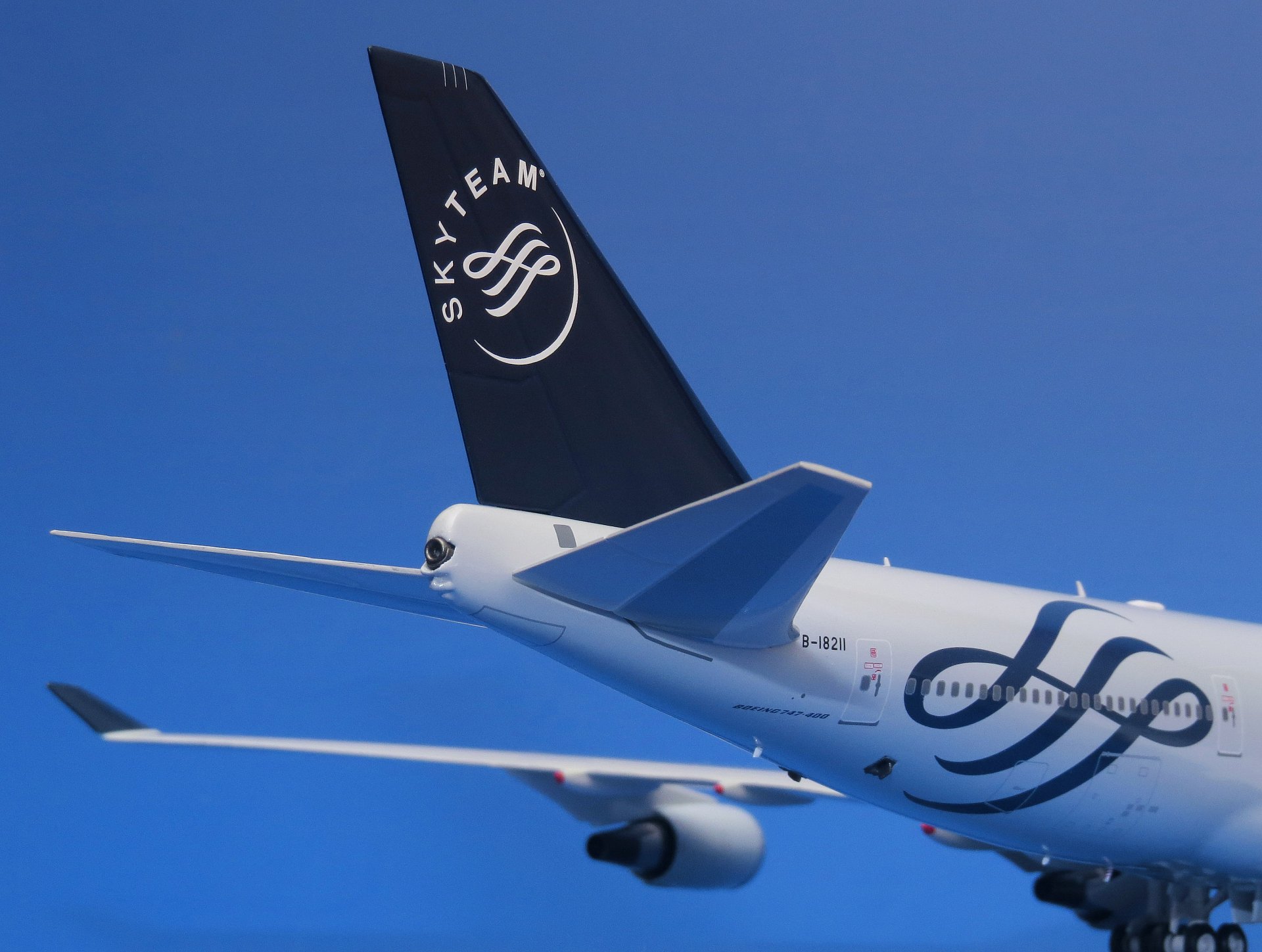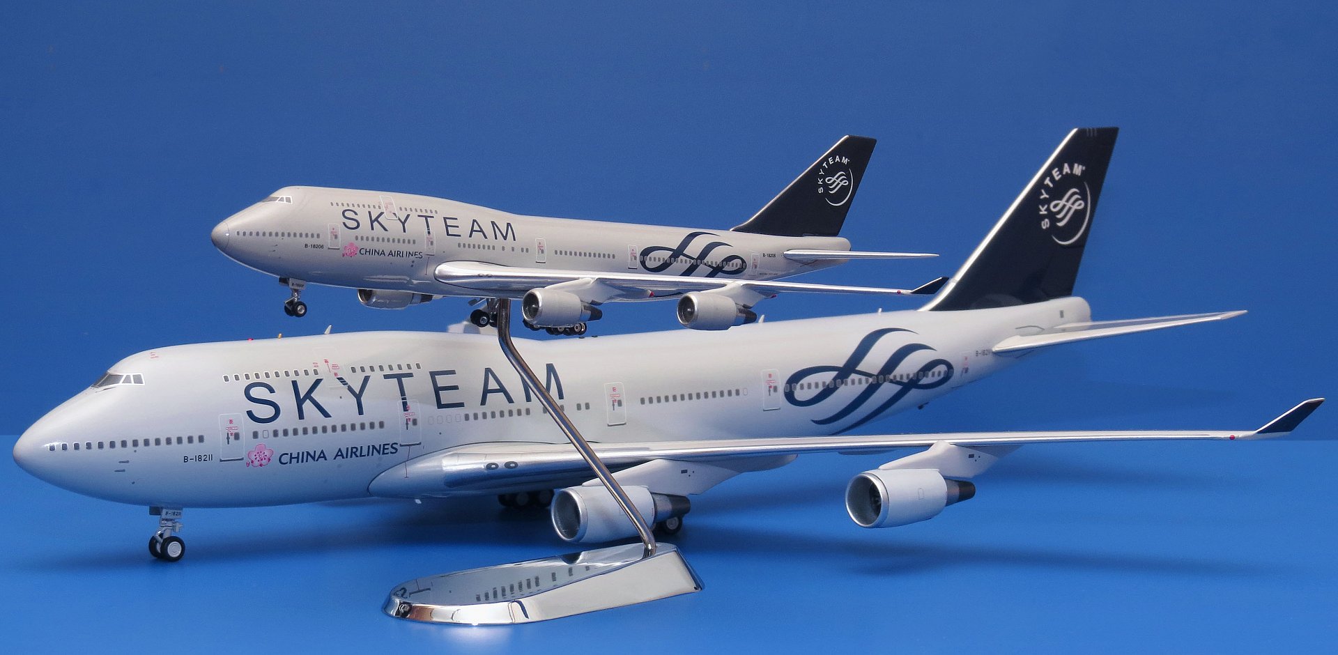 Уважаемые коллекционеры! Рад продемонстрировать подробные фотографии модели самолёта Boeing 747-400 авиакомпании China Airlines в фирменной ливрее альянса SKYTEAM. В моей коллекции уже есть модель аналогичного самолёта в масштабе 1:400 (от Phoenix), в такой же ливрее, но с бортовым номером B-18206. А представленная модель, в масштабе 1:200, имеет регистрацию B-18211. Всего в авиакомпании China Airlines было 2 таких Боинга, и оба, к сожалению, на сегодняшний день выведены из эксплуатации.