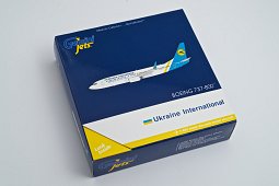 Модель самолёта Boeing 737-800 Международных Авиалиний Украины (Ukraine International Airlines - UIA) в масштабе 1:400 от американской фирмы Gemini Jets, артикул GJAUI1363, традиционно для моделей масштаба 1:400 упакована в красочную синюю коробку из тонкого ламинированного картона с откидывающейся крышкой.