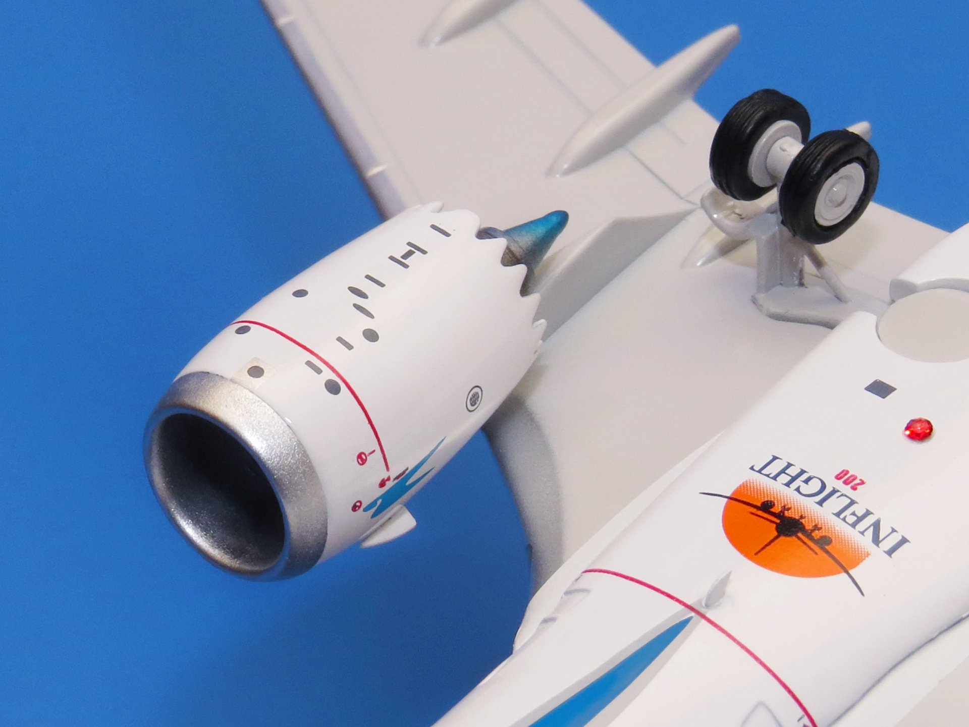 Что касается непосредственно самой модели. Планировал я эту модель к себе в коллекцию уже давно, даже задолго до того, как она была объявлена в официальном релизе. Потом ждал около 2-х лет, пока её сделают :-) В общем, модель выполнена довольно качественно. Однако, немного смущает как на пресс-форме IF200 для MAКСов исполнена кабина пилотов, а точнее боковые окна с обеих сторон. Такое впечатление, что они куда-то "вдавлены". Понятно, что на оригинальном самолёте есть определёнyая вогнутость в этом месте на фюзеляже, но на модели она выглядит слишком явно. В целом, модель имеет высокий уровень детализации: мелкие технические надписи, антенны, маячки, вращающиеся лопатки вентиляторов двигателей, крутящиеся колёса с резиновыми покрышками. Кстати, о колёсах. Они сделаны очень условно. Кто имеет ранние модели Боингов от Джемини, меня поймёт... Да и вообще, видимо в целях экономии, такие же колёса, как у Боингов, стоят и на других инфлаевских моделях, как например на А320-ом семействе. Из плюсов. Очень понравилось, как выполнены двойные винглеты на крыльях. Они тонкие, и геометрически соответствуют реальному прототипу. И если бы не кабина, то эту пресс-форму можно было бы назвать даже лучшей, чем у Gemini. Модель комплектуется подставкой, и имеется опция полётной конфигурации (без шасси).