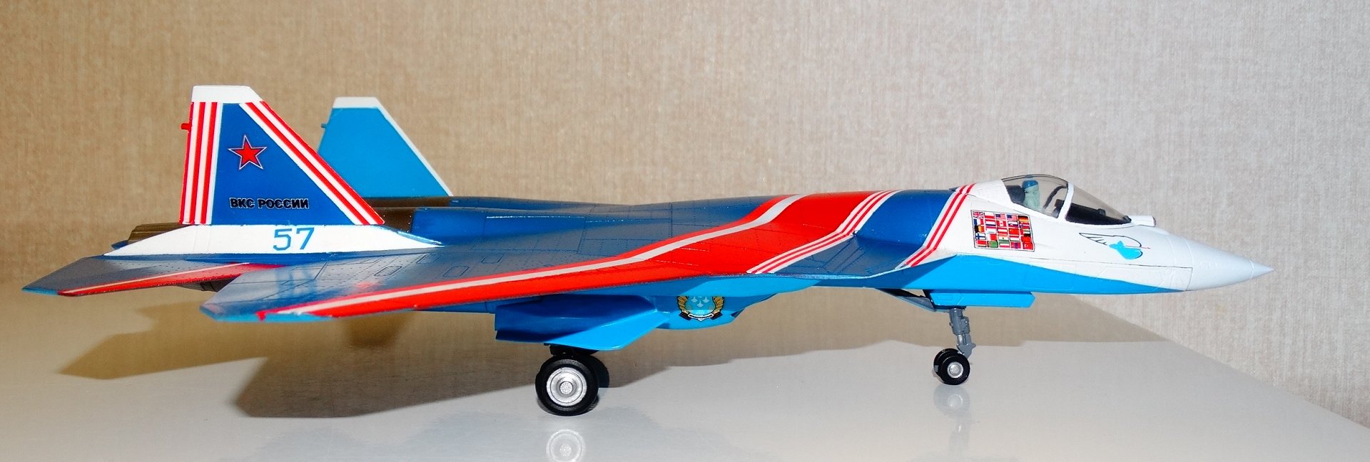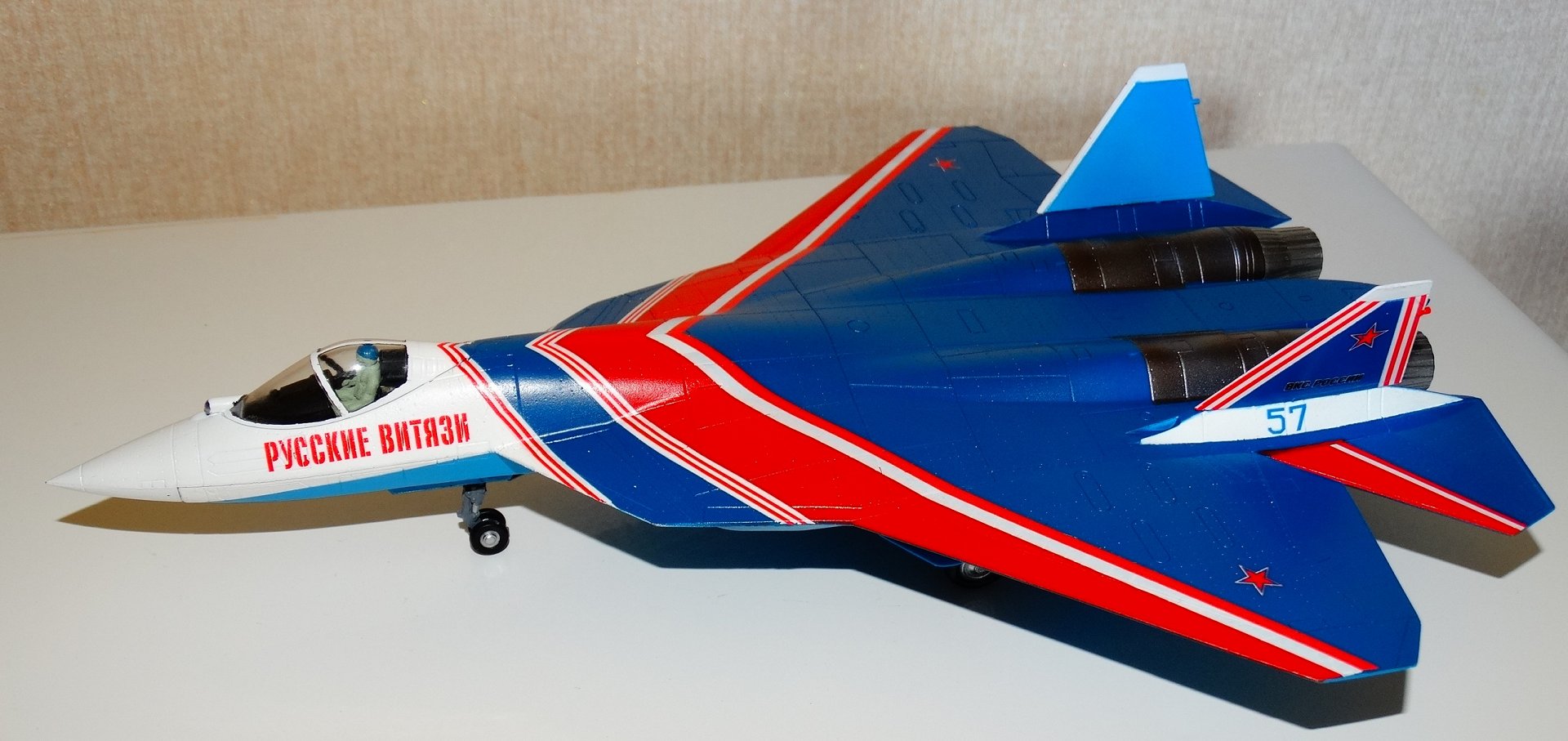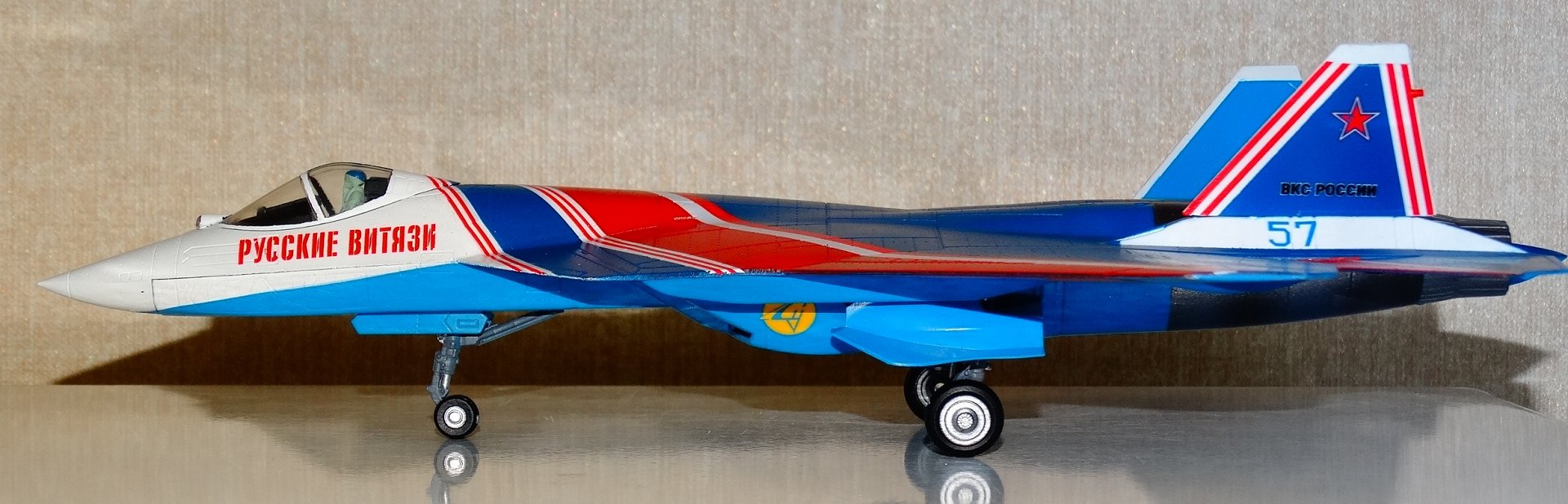 Сегодня хочу представить "фантазию на тему" - модель Су-57 в цветах АГВП "Русские Витязи" в масштабе 1/72. Я питаю слабость к пилотажным группам, особенно "Русским витязям" и как-то в разговоре с другом-моделистом возникла идея сделать вот такой кастом-проект: