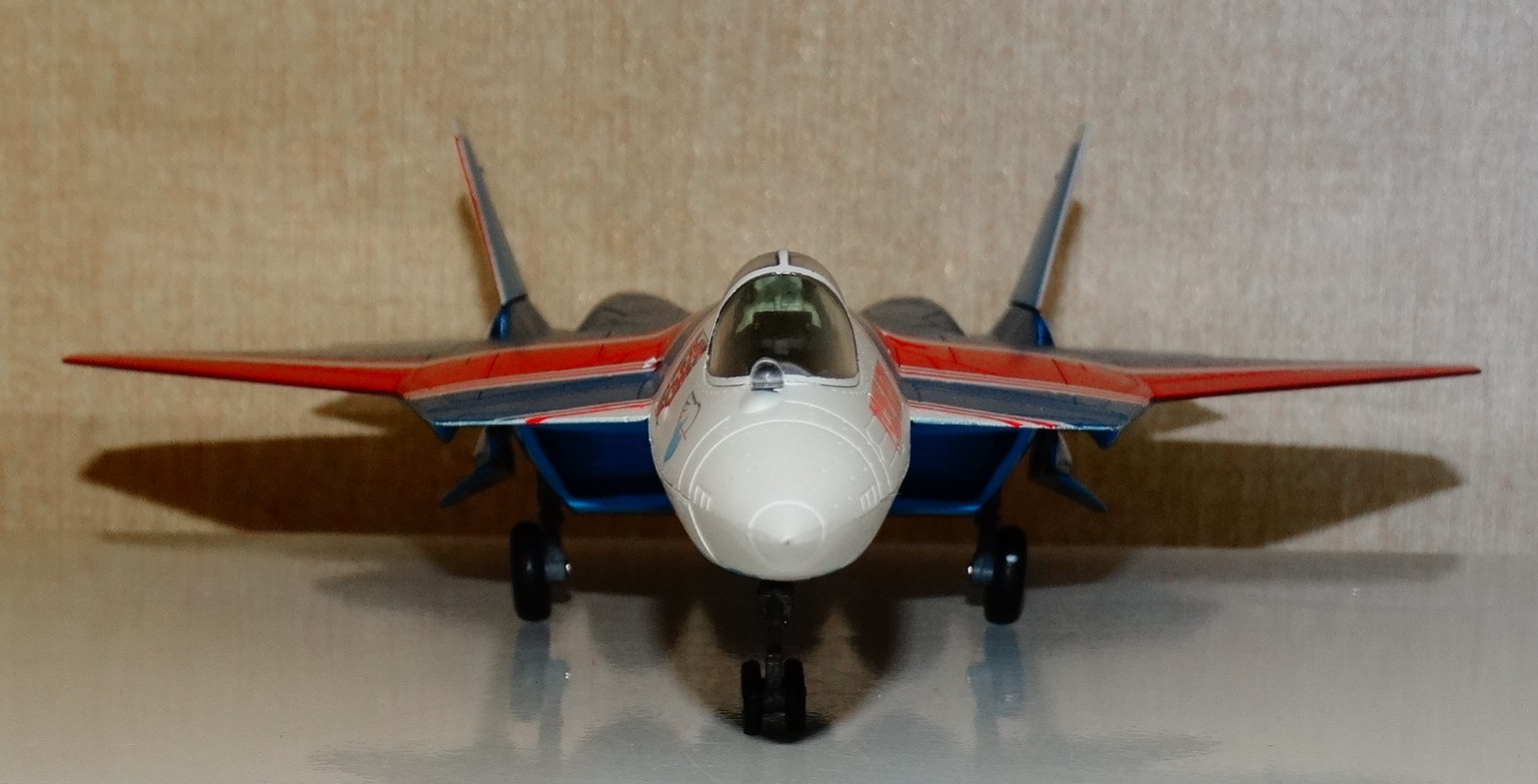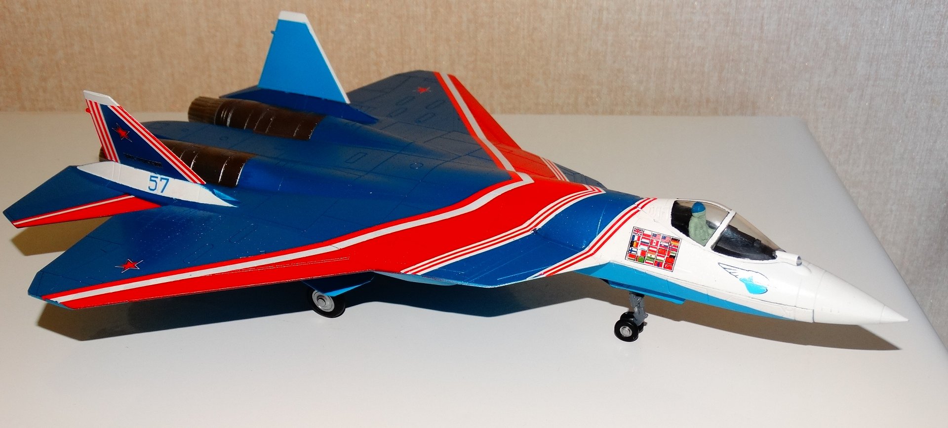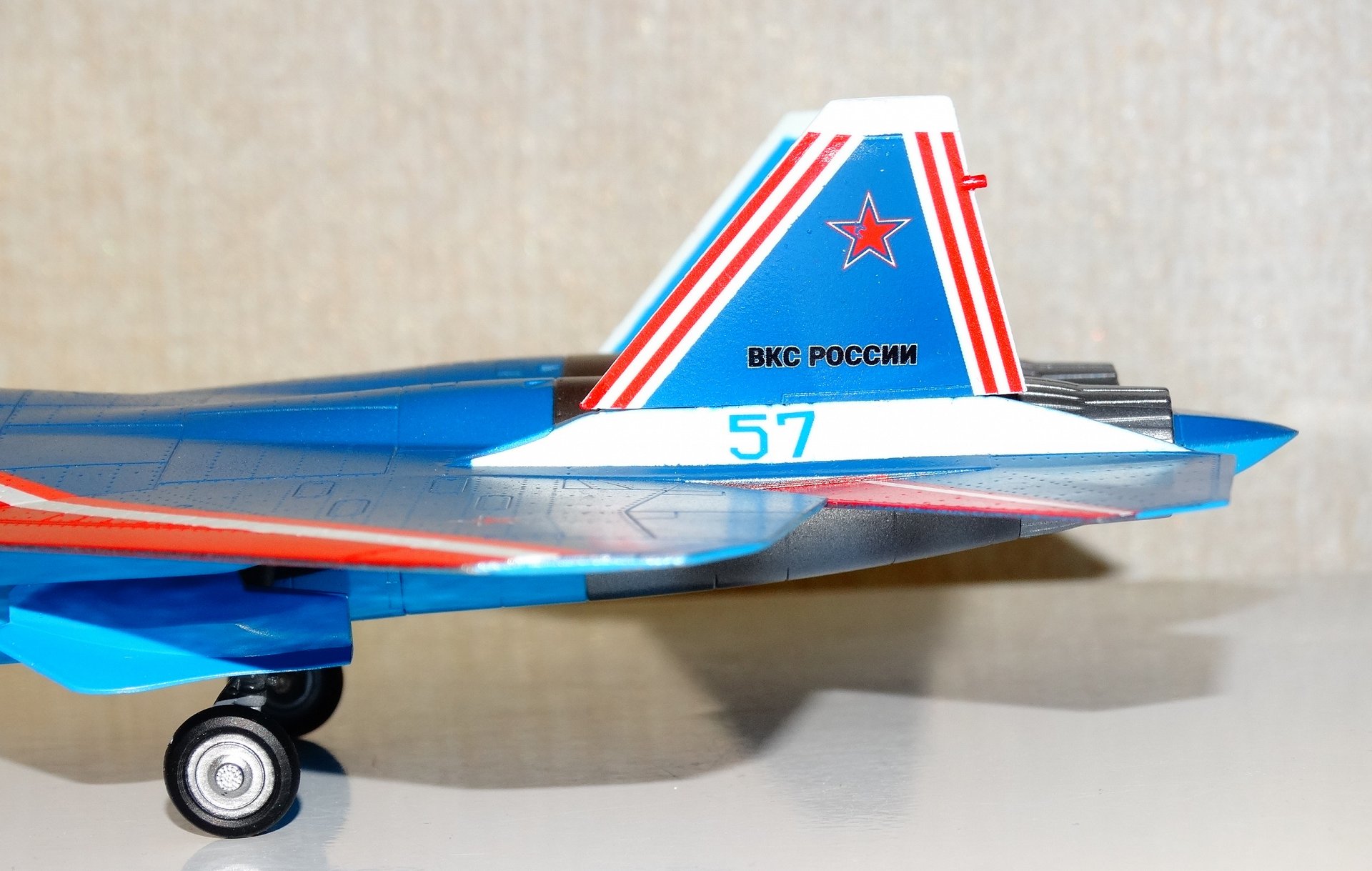 Сегодня хочу представить "фантазию на тему" - модель Су-57 в цветах АГВП "Русские Витязи" в масштабе 1/72. Я питаю слабость к пилотажным группам, особенно "Русским витязям" и как-то в разговоре с другом-моделистом возникла идея сделать вот такой кастом-проект:
