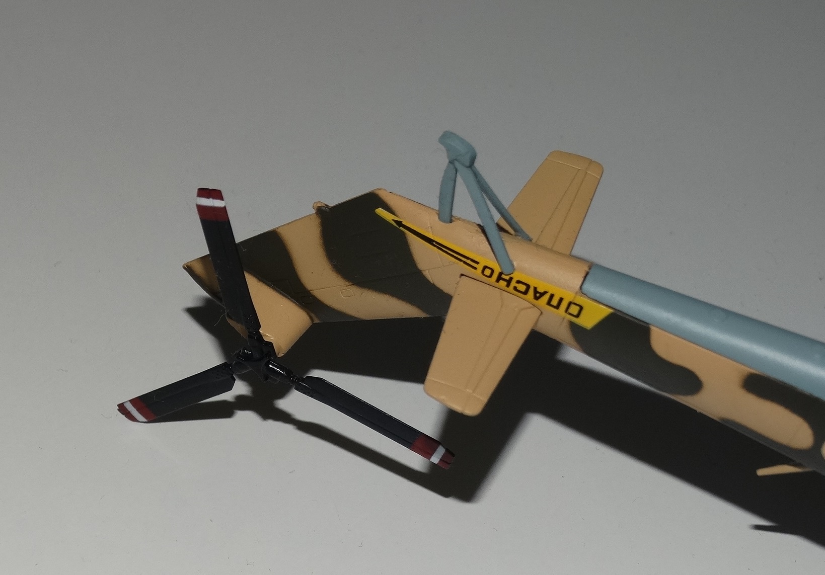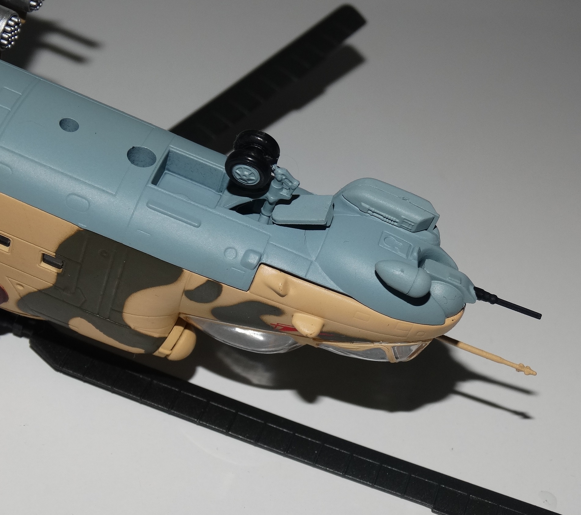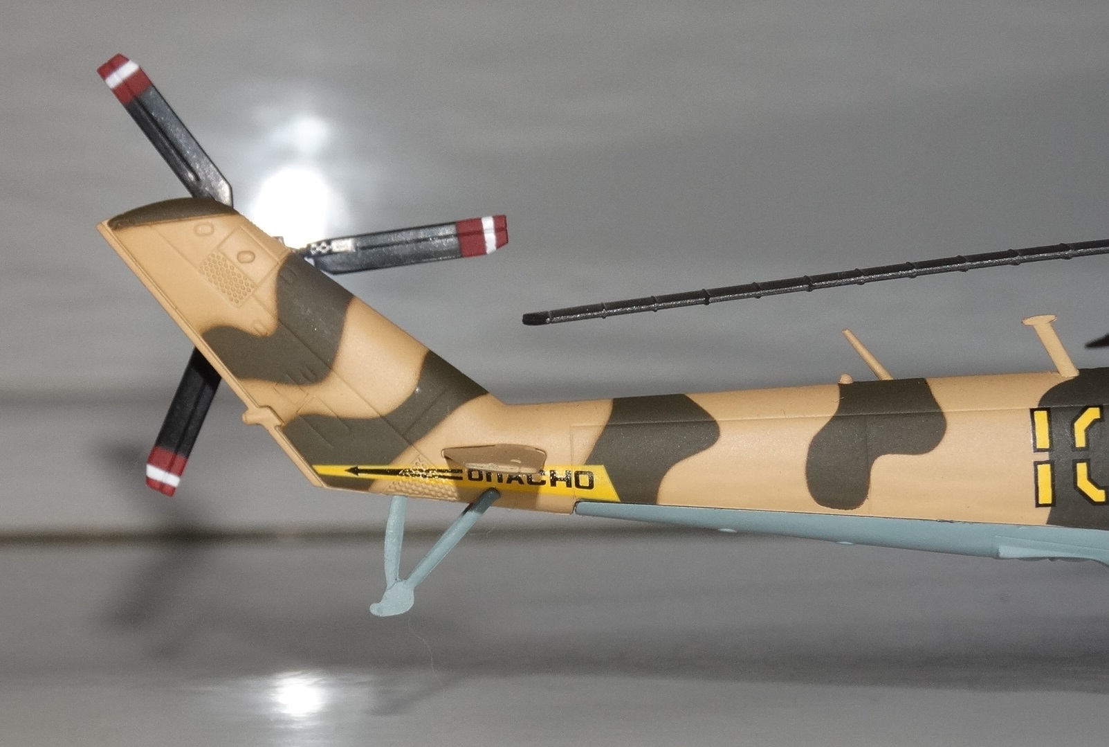 Модель изготовлена из металла с использованием пластиковых элементов, несущий и рулевой винты вращаются, фигурками пилотов модель не комплектуется, фонарь кабины не открывается.