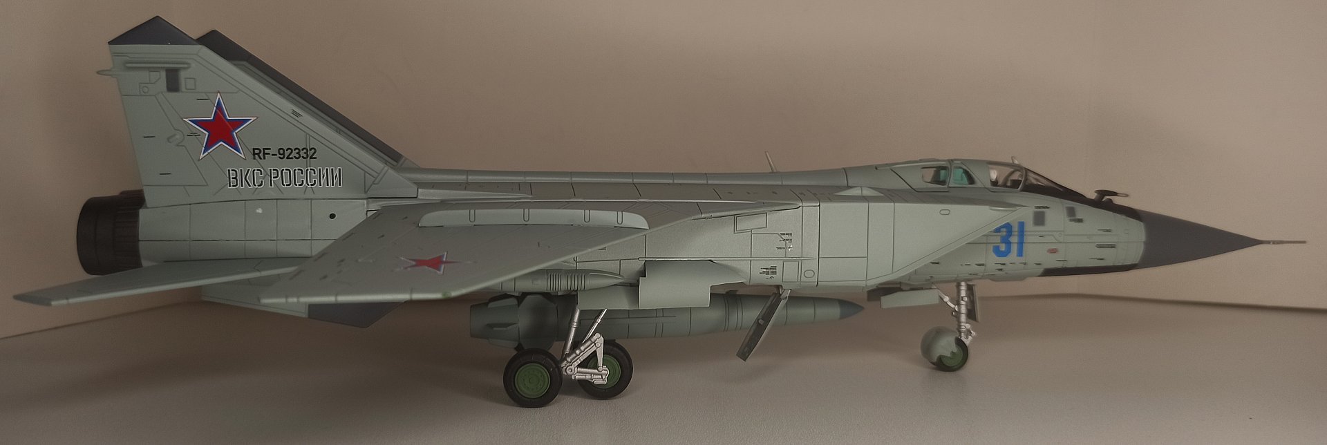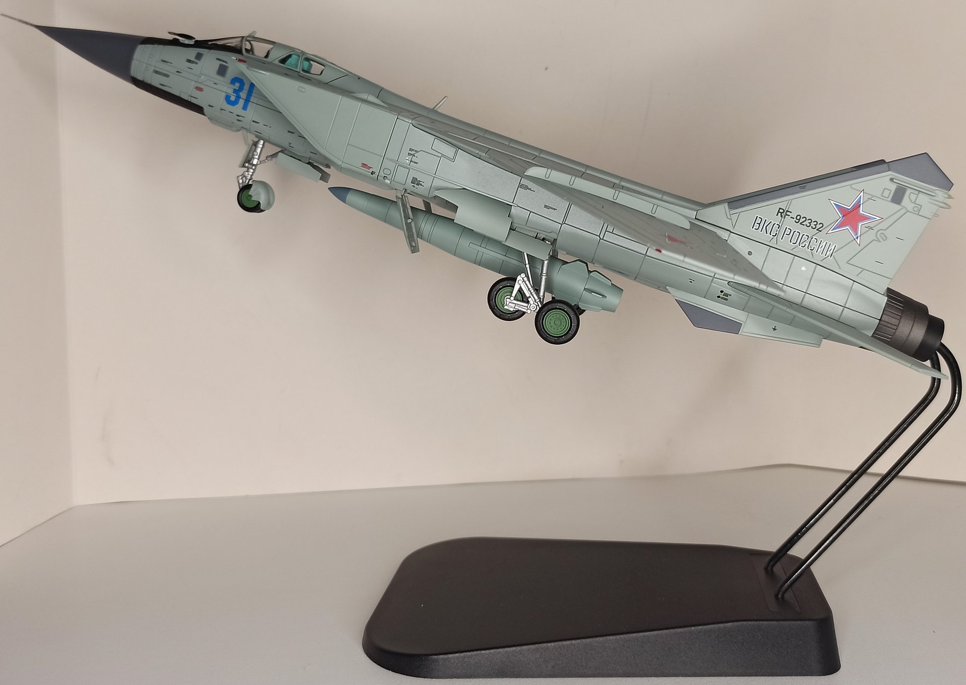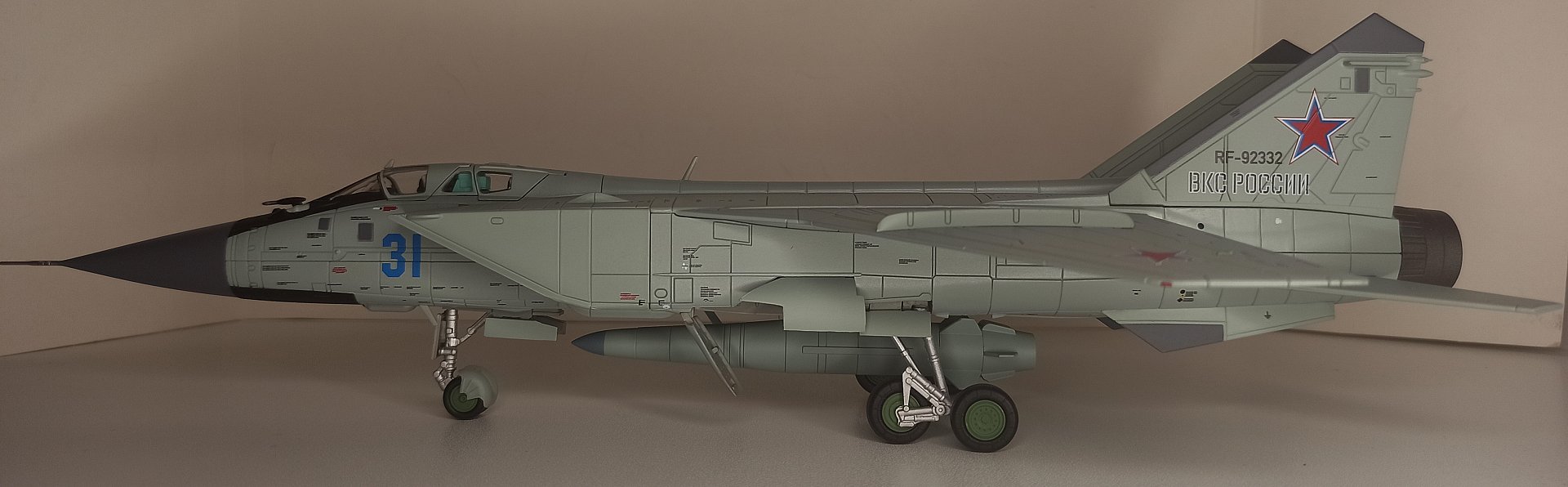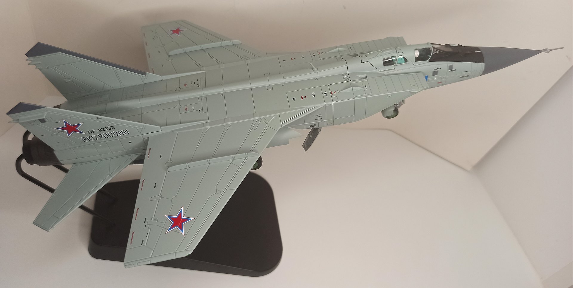Первая модель МиГ-31 от хобби мастера. Во многом долгожданная, так как среди коллекционных моделей 31-го у нас были altaya в 2 вариантах окраски (борт 903 с авиасалона и борт 08 "Борис Сафонов") и китайская реплика алтаи, копирующая 08 с толстым ПВД (успел себе и такую взять). Плюс ещё первая модель была сразу с "кинжалом". Но обо всем по порядку.