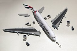 Интересно также посмотреть на то, из чего получаются модели. Разложенная по частям модель самолета Airbus A380 в масштабе 1:500: