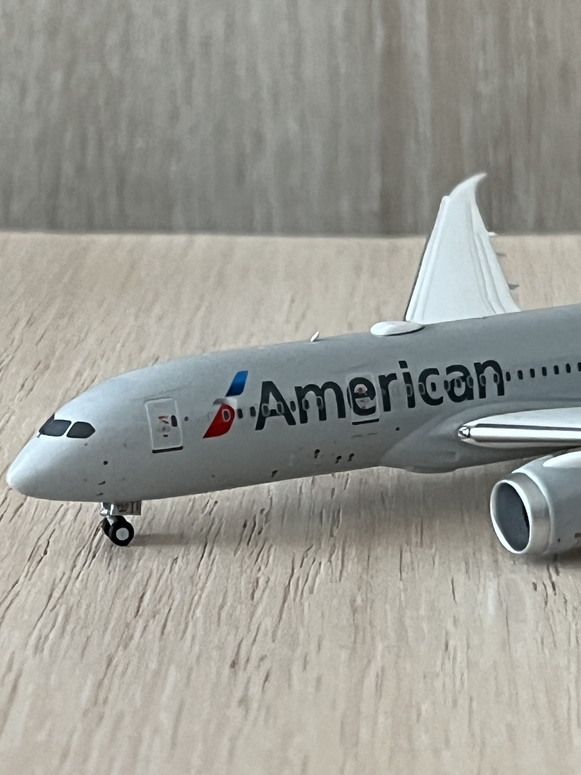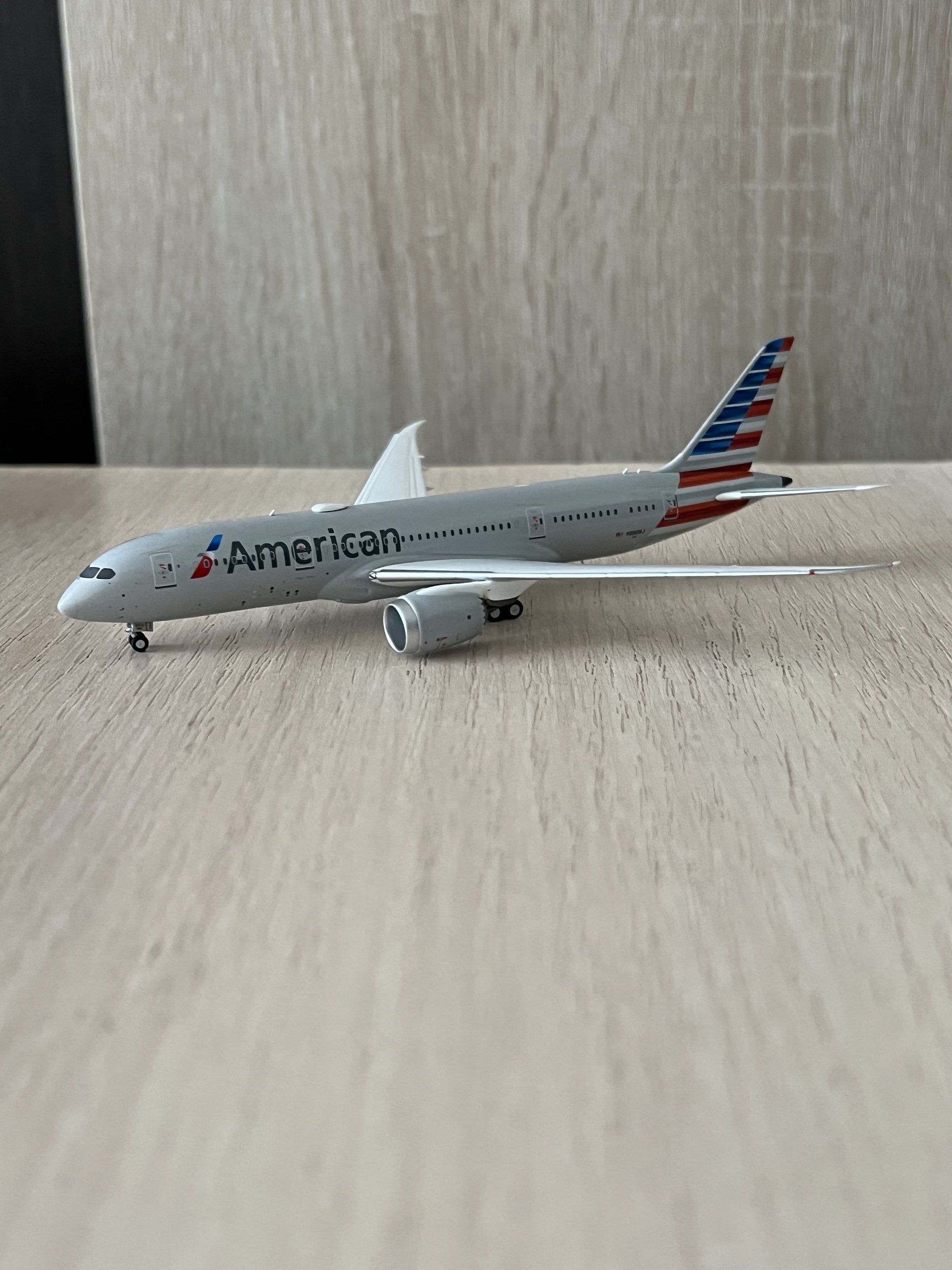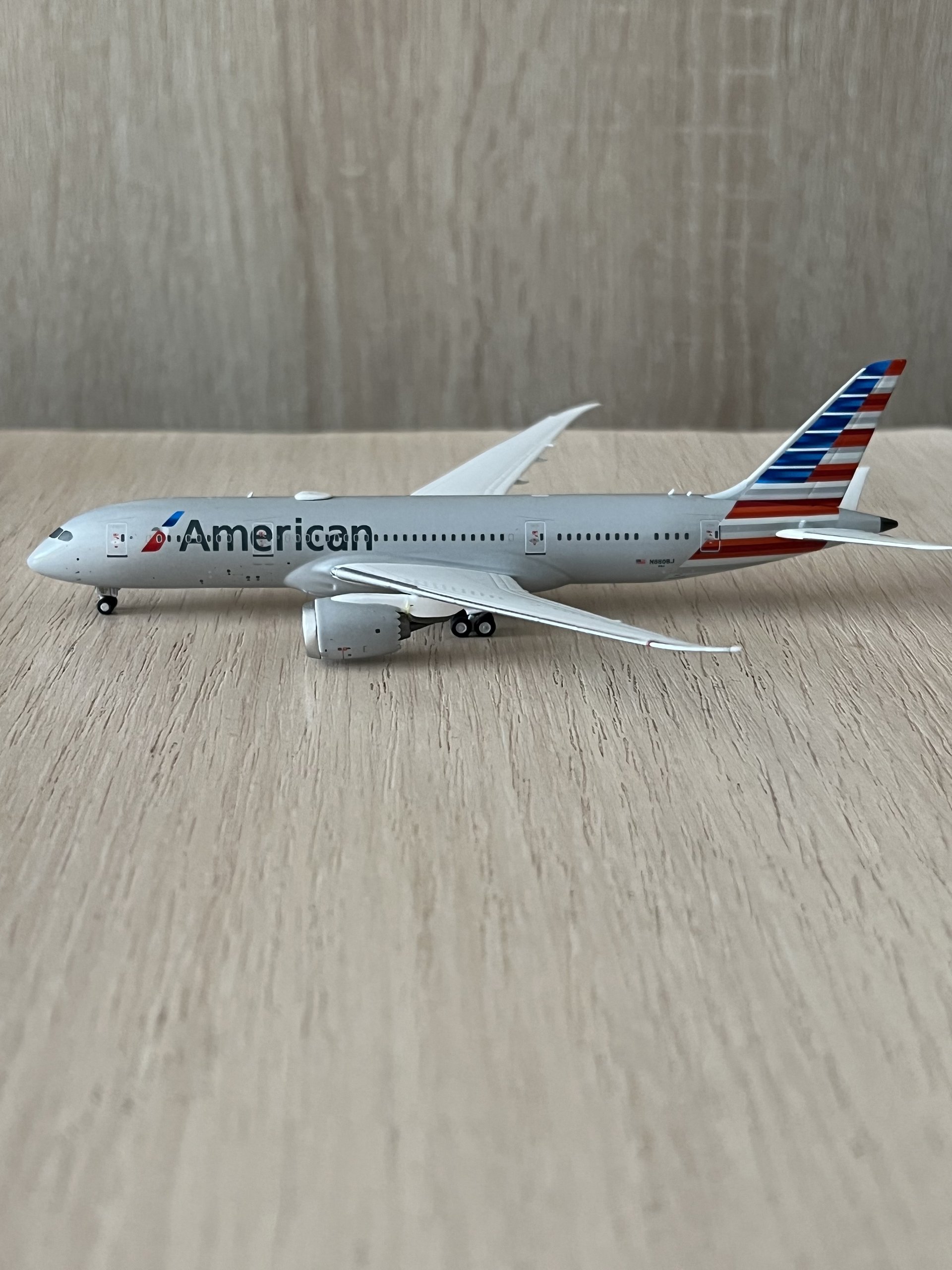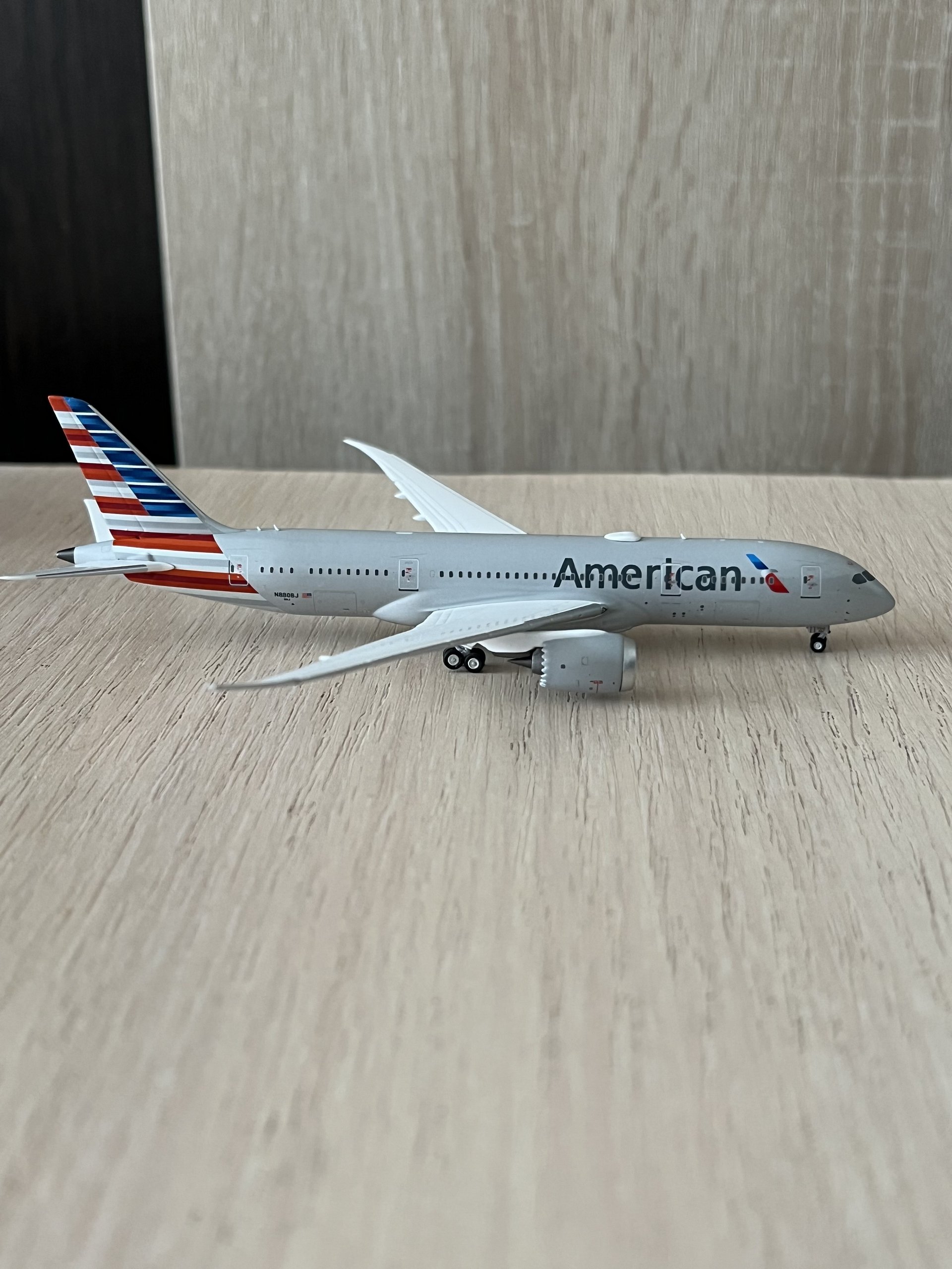 Современный авиалайнер Boing-787-8 в ливреи American Airlines представляет собой литую металлическую модель полной сборки в масштабе 1:400. На серебристом фюзеляже располагаются резные антенны, а оснащение двумя детализированными двигателями придает модели полную реалистичность. Хвост расписан в цвет ливреи полосками оттенков красного, синего и белого цвета. На борту самолета можно рассмотреть номер N880BJ, а также мелкие технические надписи. С размещением лайнера в вашем домашнем аэропорту также не возникнет проблем благодаря крутящимся колесам с резиновыми покрышками.