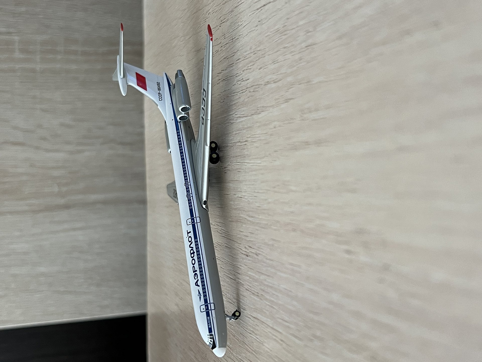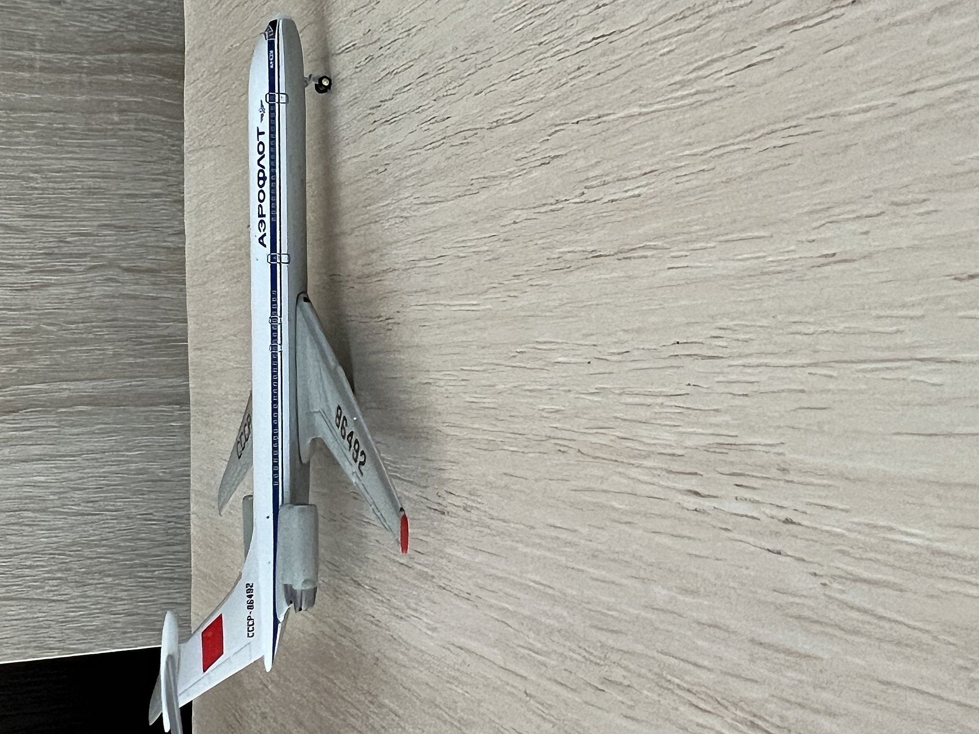 Абсолютно реалистичная модель самолета Ильюшин Ил-62М в ливреи авиакомпании Аэрофлот в окрасе 1980-х гг. и масштабе 1:400. Борт номерован СССР-86492, к слову, его оригинальная модель является памятником и стоит в аэропорту Шереметьево. Данная модель станет жемчужиной коллекции любого авиалюбителя, является полностью готовой, оснащена детализированными двигателями в хвостовой части, шасси с крутящимся колесами с резиновыми покрышками. Особую эстетику модели придает ретро раскрас представляющий собой белый фюзеляж с горизонтальными синими полосами в стиле Аэрофлот, крылья и двигатели модели окрашены в серебристый цвет, на крыльях с обеих сторон есть надписи:СССР и 86492, чередующиеся на верхней и нижней поверхности с обеих сторон. Хвост самолета достаточно необычный, на его пике будто размещен еще один маленький самолетик.
