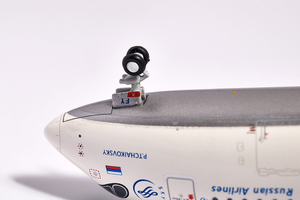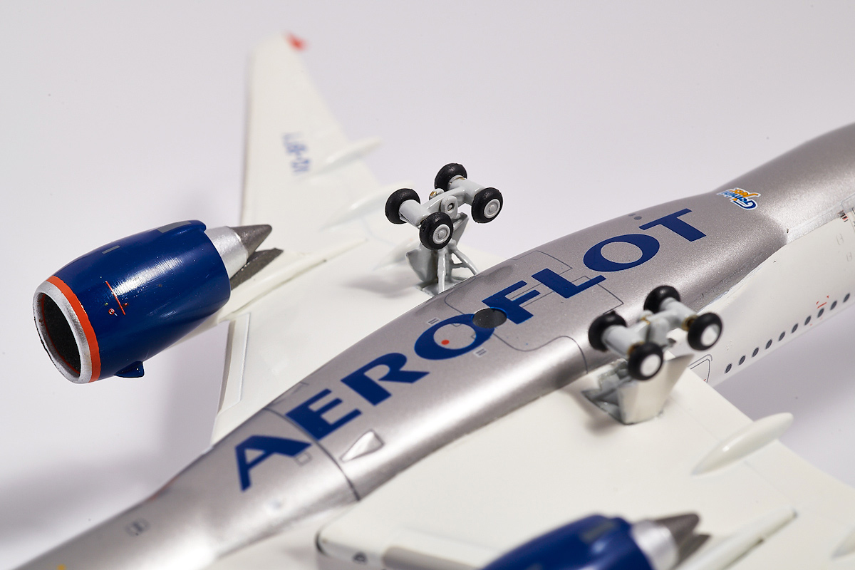 На "брюхе", как у реального самолета, нанесена надпись AEROFLOT. Рядом можно заметить маленький логотип GeminiJets - это уже аксессуар производителя модели, на авиалайнере-прототипе его нет.