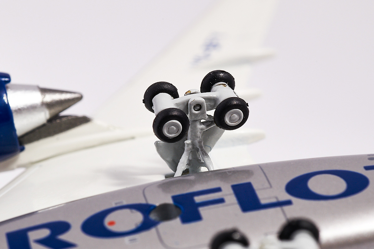 Далее двигатель снизу, а также опора основной стойки шасси крупным планом. Тележка шасси выполнена достаточно упрощенно (все-таки это 400-й масштаб), но содержит несколько усложняющих элементов.