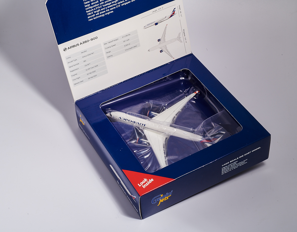 В каталоге GeminiJets модель A350 получила артикул GJAFL1943. Она упакована в традиционную коробку темно-синего цвета. Коробка сделана с открывающийся крышкой, на обороте которой размещена краткая информация про самолет.