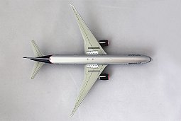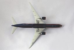 Внизу модель имеет отверстие, что позволяет установить ее на подставку (которая не входит в комплект модели). Наиболее удачно модель смотрится с деревянной подставкой для моделей 1:400 от GeminiJets. Далее фото такой комбинации модели с подставкой. Обратите внимание на отклоненные тележки основных стоек шасси, точно передающие положение колес Боинга-777 в полетном состоянии.
