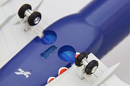 Сама модель изготовлена из твердого пластика и имеет следующие размеры: длина - 20 см, ширина (размах крыла) - 17 см. В комплект с моделью входит пластмассовая подставка, позволяющая экспонировать самолет в "летящем" состоянии.
