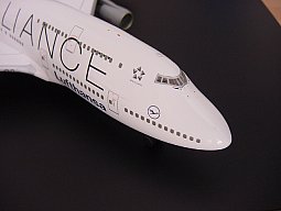 До выпуска модели Airbus A380 в масштабе 1:200, самолеты Боинг-747 были самыми крупными моделями в каталоге Herpa. Взглянем поближе на модель Boeing 747-400 Lufthansa в окраске Star Alliance. Носовая секция выполнена просто фантастически. Посмотрите на детали - окна, дворники, датчики, аварийный выход и детали дверей - это только начало. Хотя иногда окна в Боингах-747 в 200-м масштабе имеют портящий внешний вид щели, в данной модели прозрачное остекление кокпита подходит отлично. Форма носа также правильная.