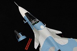 Под крылом присутствует полный набор вооружения самолета, состоящий из ракет и управляемых бомб.