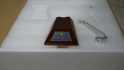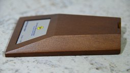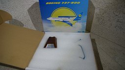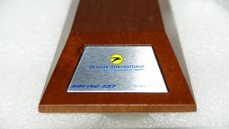Деревянная подставка для модели выполнена с алюминиевой стойкой. Она аналогична модели XXSTDS «Универсальная подставка 1:200 и 1:400», но с логотипом авиакомпании МАУ, надписью «Ukraine International Міжнародні Авіалінії України» в центре таблички, маркой самолета BOEING 737 в левом углу и указанием масштаба Scale 1:200 в правом углу. Всё эти надписи вполне компактно и гармонично смотрятся на блестящей алюминиевой табличке подставки.