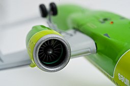 Отдельного внимания заслуживают двигатели. На А320neo устанавливаются двигатели Pratt&Whitney Pure Power PW1100G-JM, которые визуально выглядят крупнее моторов классических А320. На модели эти изменения габаритов и диаметра компрессора также точно воспроизведены. Несколько утрированно имитирована даже "спиралька" на коке двигателя.