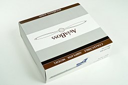 Коробка с моделью покрывается фирменным шубером AviaBoss в бело-серо-коричневом исполнении.
