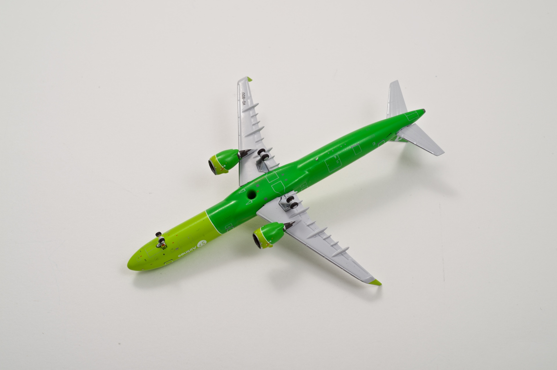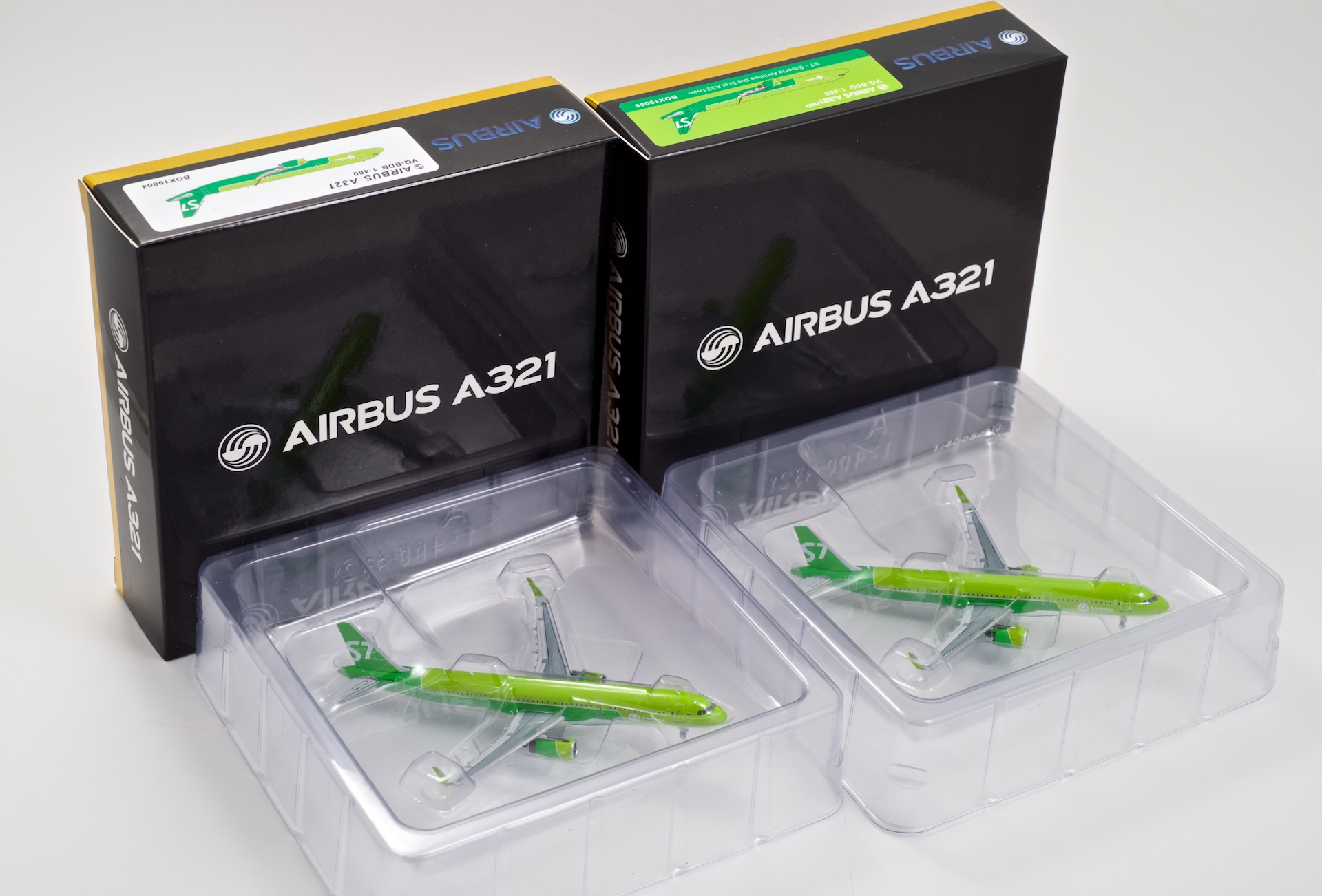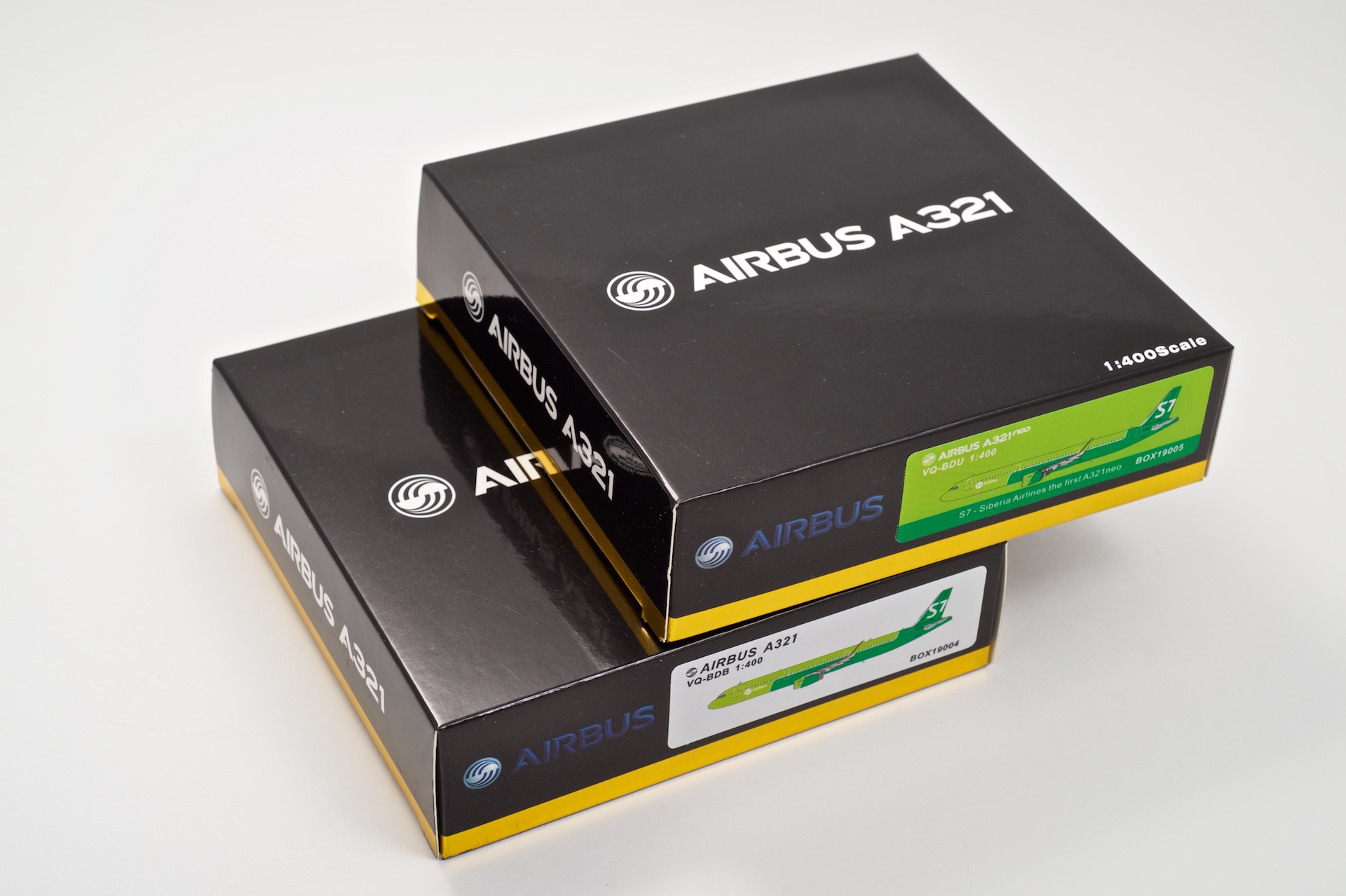 Таким же образом изготовлены и модели Аэробусов А321 S7 Airlines. Модели помещены в прозрачные блистеры, а затем в картонную коробку черного цвета.