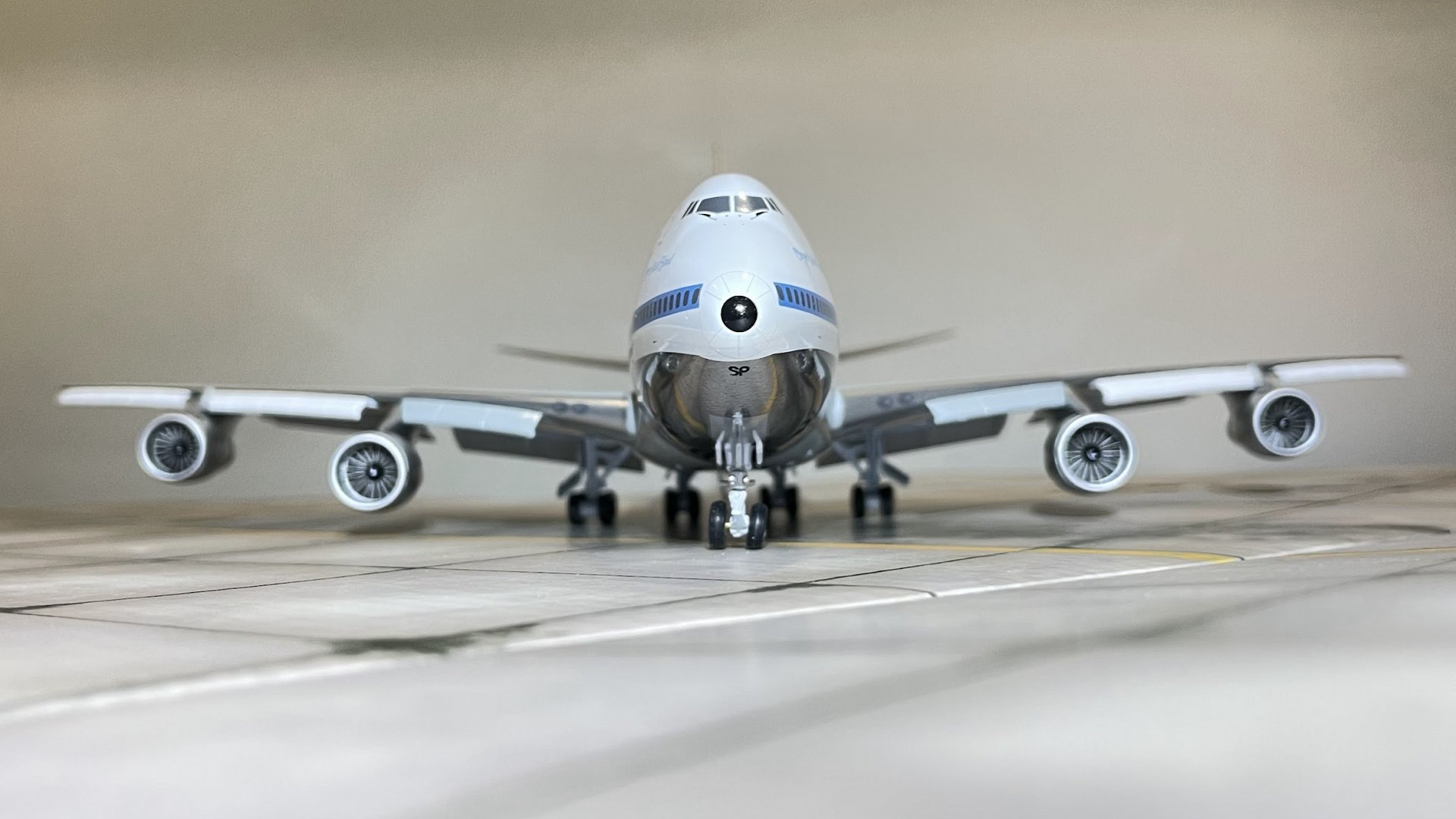 Представляю вашему вниманию модель самолета Boeing 747SP, в конфигурации выпущенного положения механизации крыла во взлетное положение. Boeing 747SP является модификацией модели Boeing 747, предназначенной для сверхдальних перелётов. SP означает «Special Performance» («особые характеристики»). Укороченный фюзеляж позволил достичь большей дальности и скорости полёта по сравнению с другими модификациями 747, 12 325 км с 276 пассажирами и крейсерской скорости 990км/ч. Первый самолёт 747SP вышел на линию Pan Am в 1976 году. Позже эту машину эксплуатировали в качестве частного и правительственного самолёта. В ходе эксплуатации 747SP установил несколько авиационных рекордов, однако продажи оставляли желать лучшего. Производство ограничилось 45-ю экземплярами.