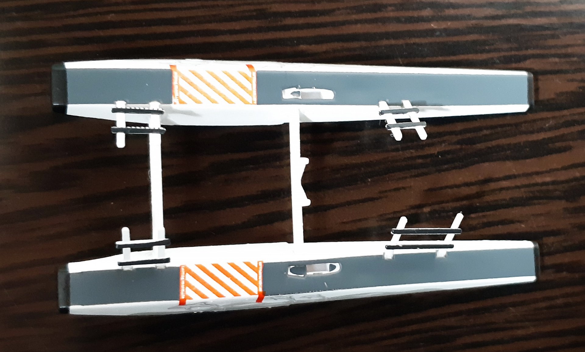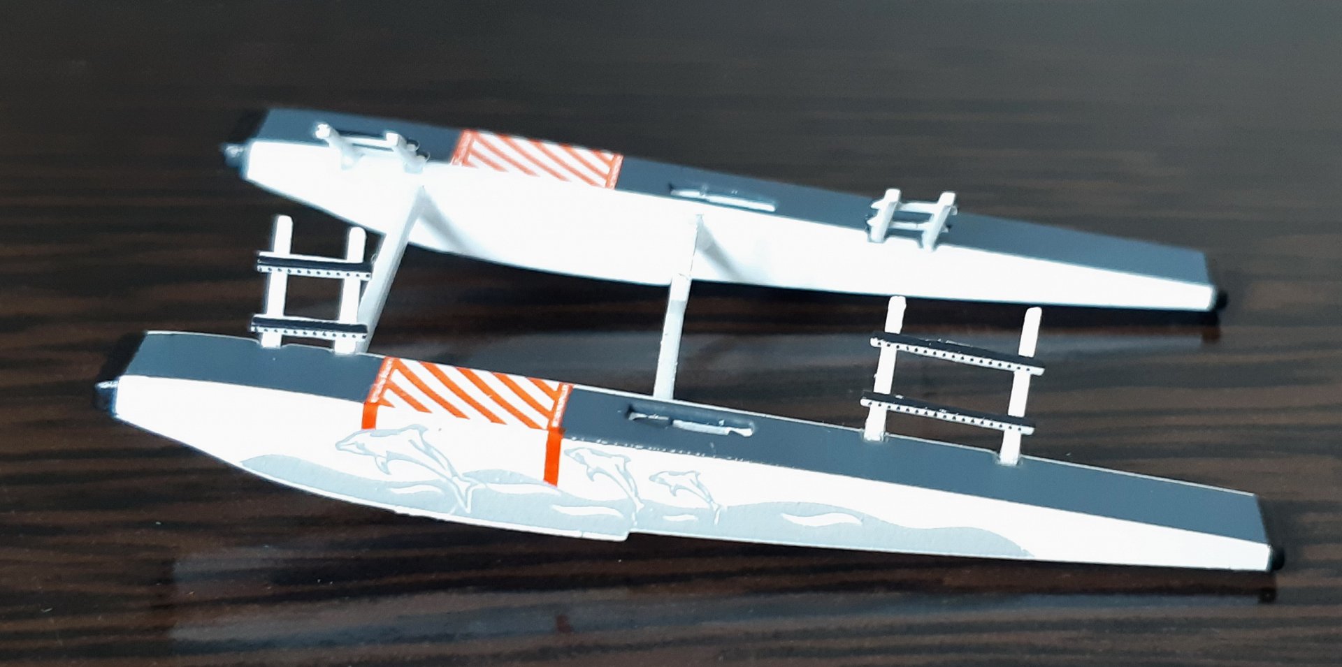 Особое внимание обращают на себя "поплавки", с прикреплёнными ступеньками, которые выполнены отдельной деталью и крепятся в 4-х точках (две внизу фюзеляжа и две к самим "поплавкам". На фото отчётливо видны места крепления.