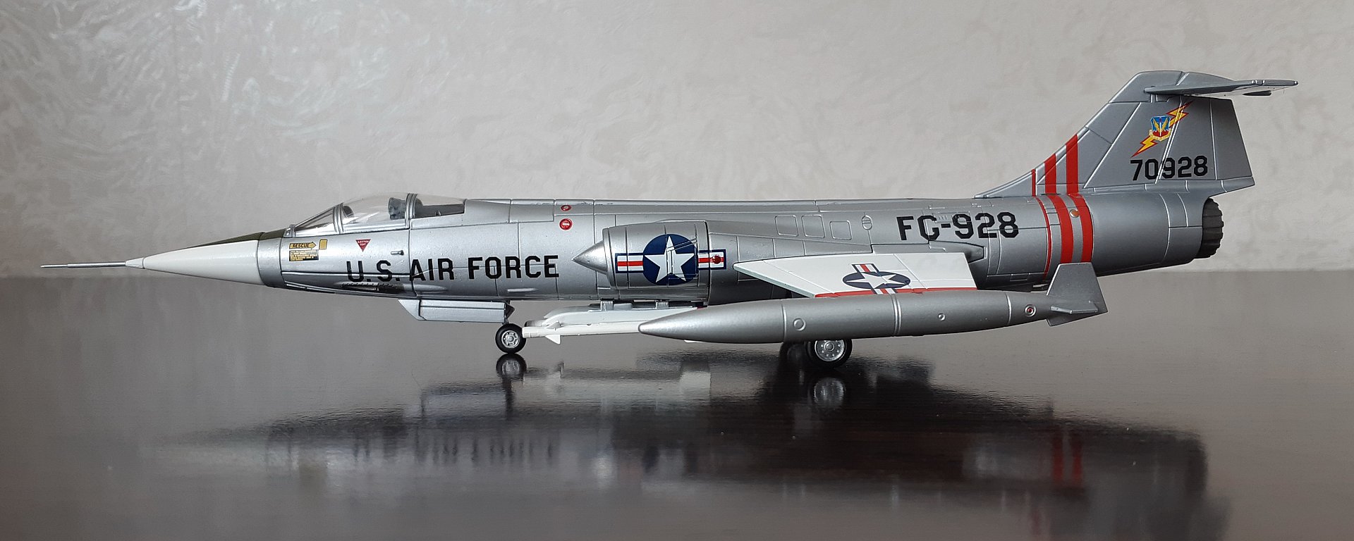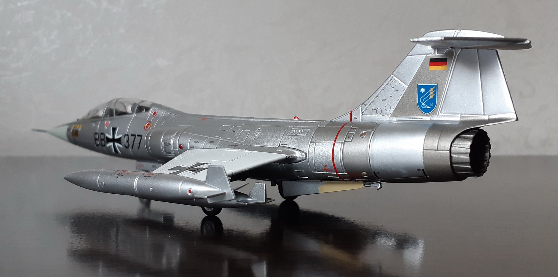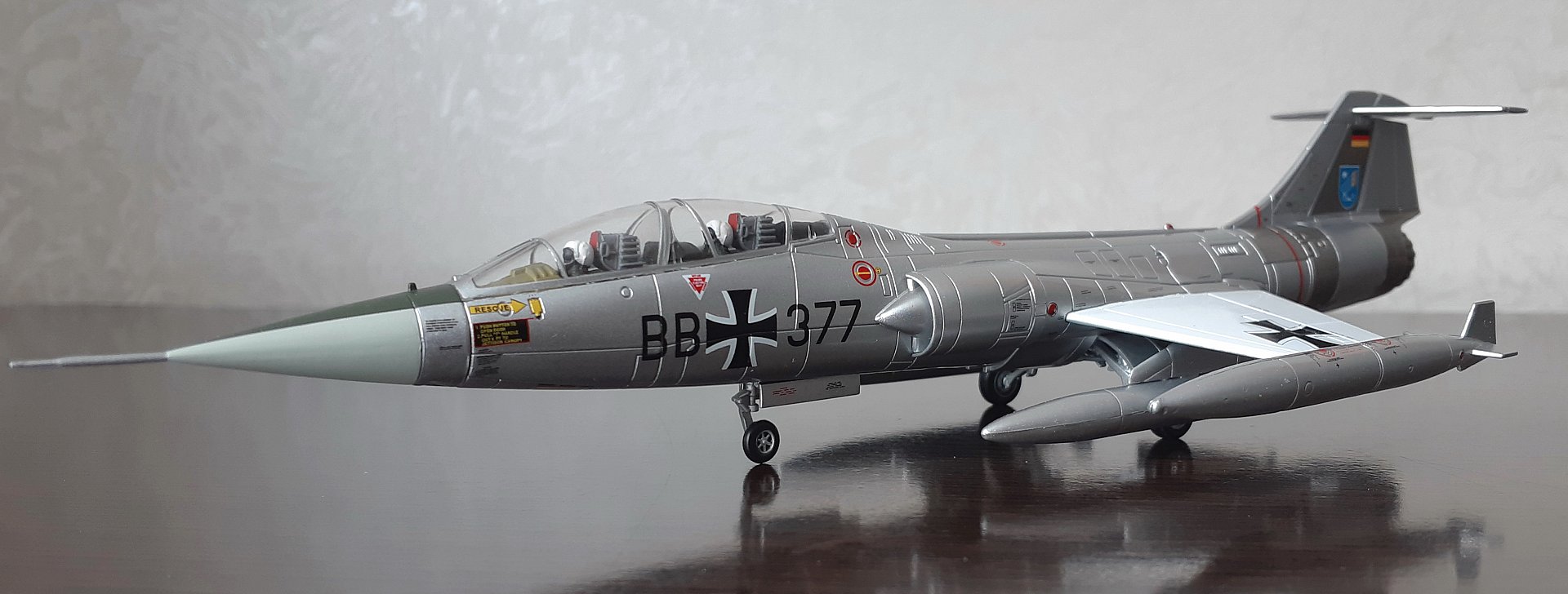 Модели сами по себе показались интересными своей необычной стреловидной конструкцией. Теперь немного об особенностях: пресс-формы обеих моделей хоть и выглядят одинаково, но немного отличаются. На «американце» от Corgi в комплекте отсутствует фигурка пилота, ПВД снимается; на «немце» от Hobby master ПВД не съемное, кабина – тандемная спарка, на самолете полностью отсутствует какое-либо вооружение включая пушку «Вулкан», в остальном модели практически идентичны. В комплекте к моделям идут подставки. Особое внимание на «немце» привлекает обилие различных тех. надписей и маркировок, пожалуй, это единственная модель F-104 от Hobby master, из всех выпускавшихся, которая может порадовать такой проработкой, чего конечно не скажешь о «американце». На нем пришлось тоже немного «поколдовать», покрасил заливные горловины крыльевых и основного топливных баков, прорисовал БАНО, проблесковый маяк, доклеил надписи USAF на правом (сверху) и левом (снизу) плоскостях, т.к. изначально на модели их не было. Дальше собственно фотографии.