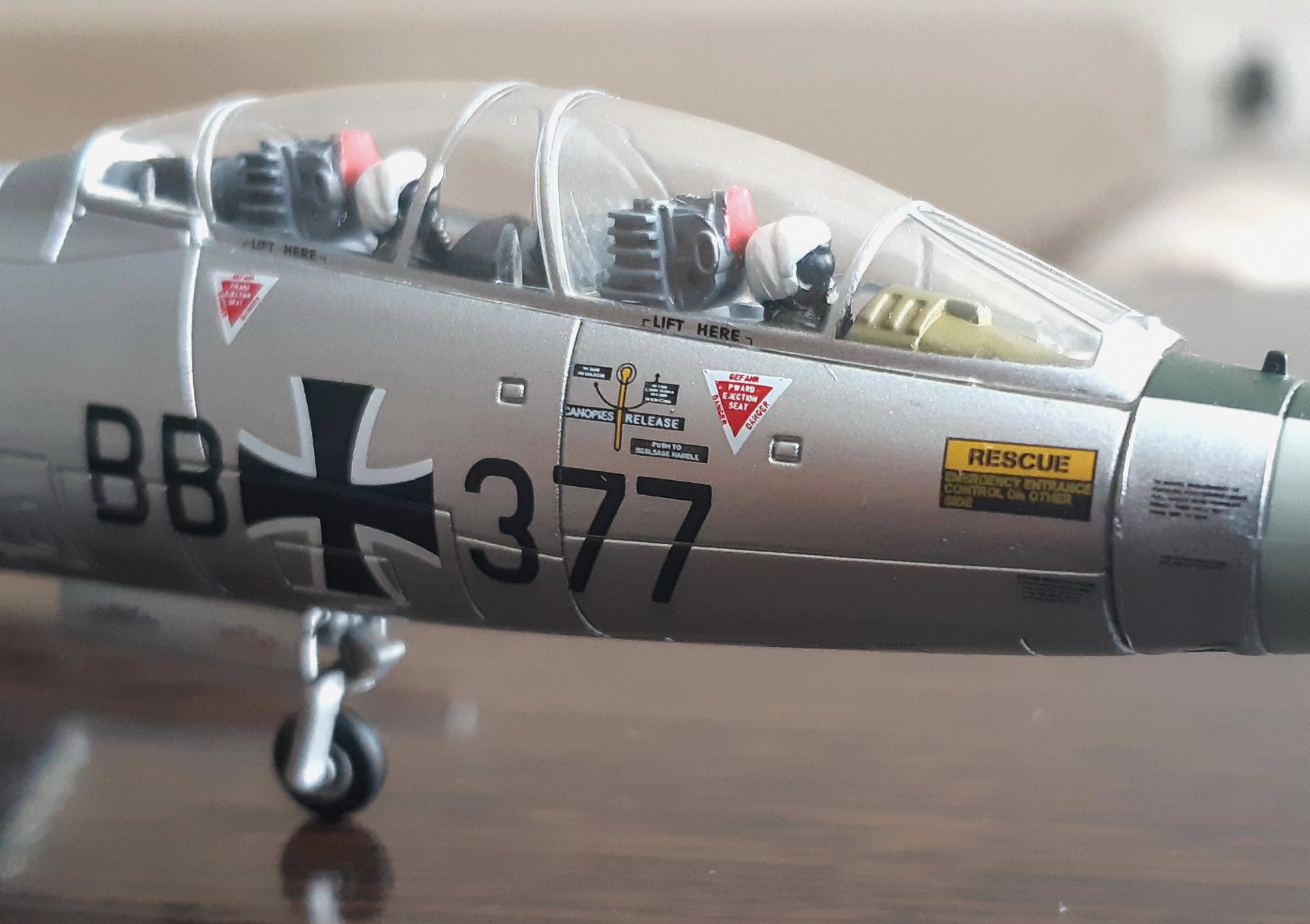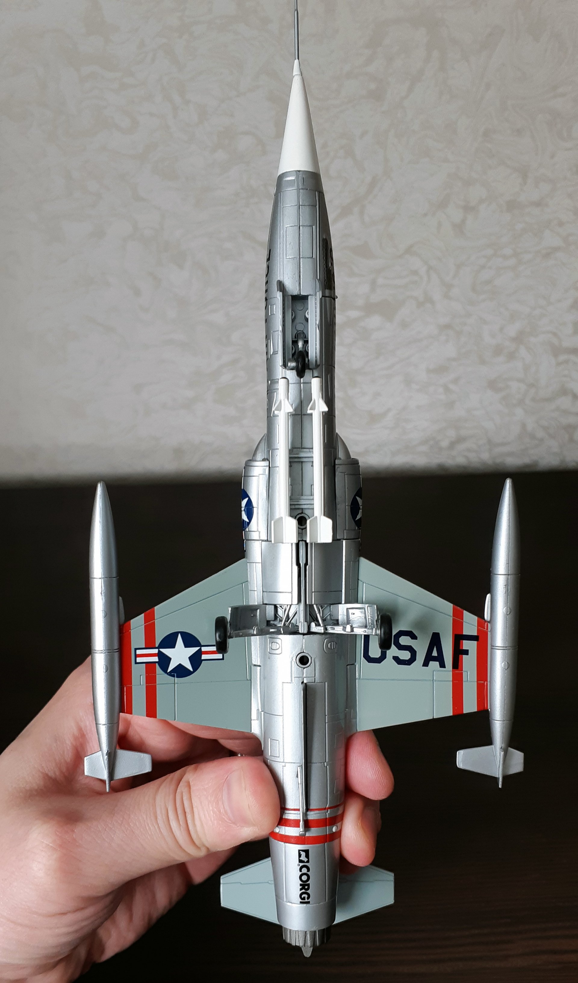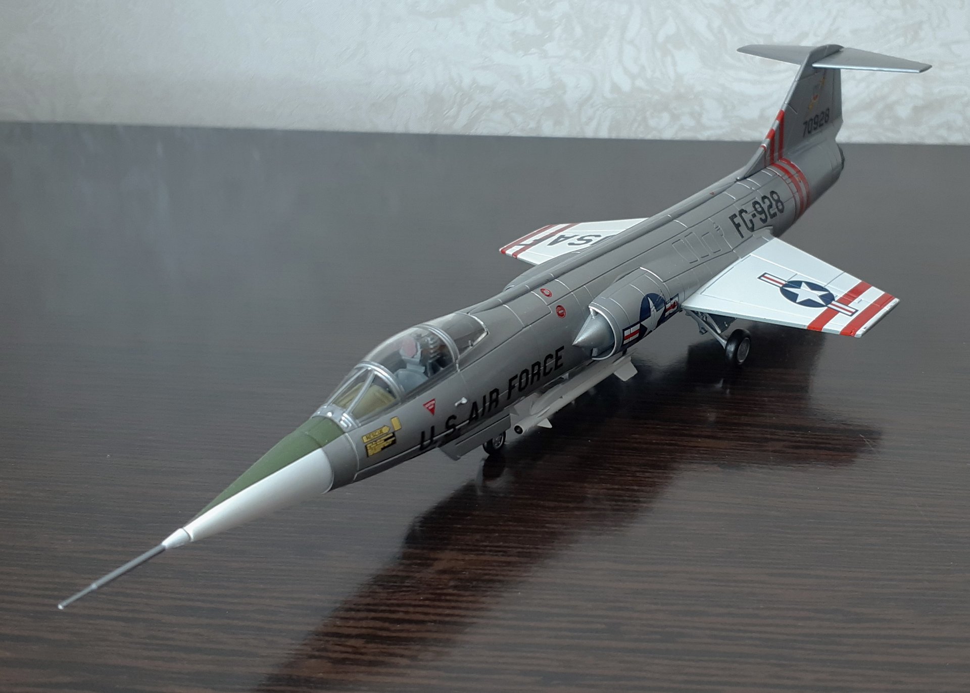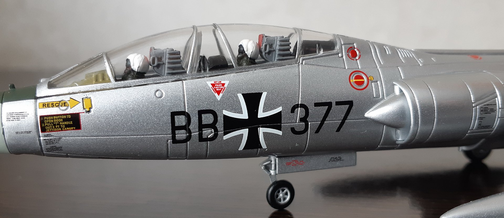 Модели сами по себе показались интересными своей необычной стреловидной конструкцией. Теперь немного об особенностях: пресс-формы обеих моделей хоть и выглядят одинаково, но немного отличаются. На «американце» от Corgi в комплекте отсутствует фигурка пилота, ПВД снимается; на «немце» от Hobby master ПВД не съемное, кабина – тандемная спарка, на самолете полностью отсутствует какое-либо вооружение включая пушку «Вулкан», в остальном модели практически идентичны. В комплекте к моделям идут подставки. Особое внимание на «немце» привлекает обилие различных тех. надписей и маркировок, пожалуй, это единственная модель F-104 от Hobby master, из всех выпускавшихся, которая может порадовать такой проработкой, чего конечно не скажешь о «американце». На нем пришлось тоже немного «поколдовать», покрасил заливные горловины крыльевых и основного топливных баков, прорисовал БАНО, проблесковый маяк, доклеил надписи USAF на правом (сверху) и левом (снизу) плоскостях, т.к. изначально на модели их не было. Дальше собственно фотографии.