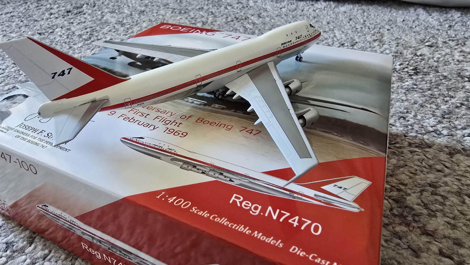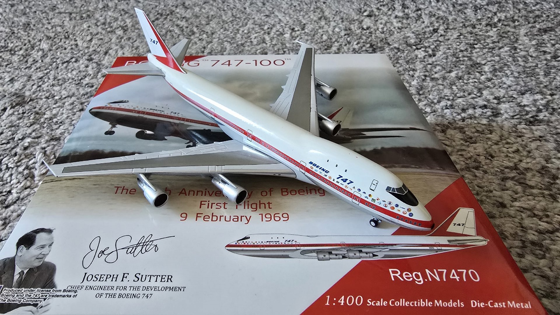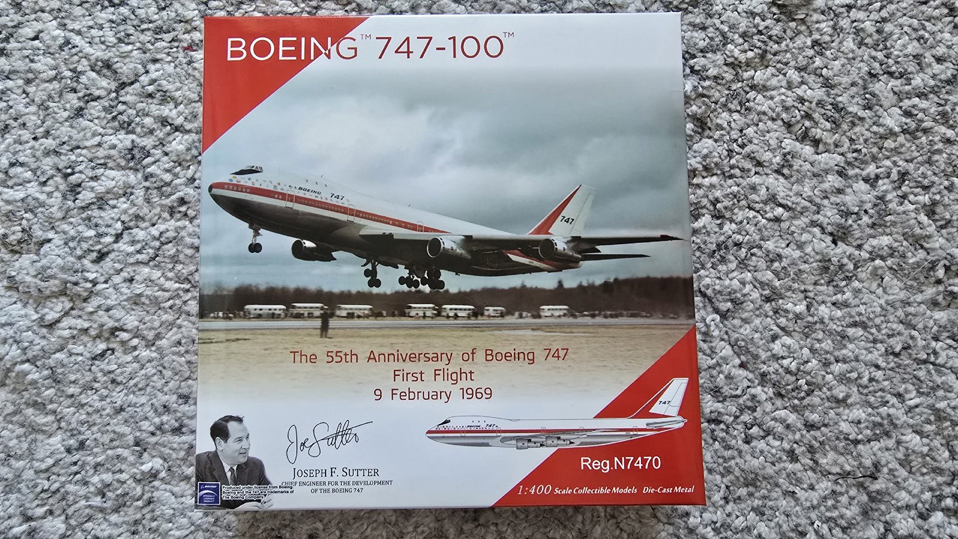 Сегодня я покажу вам более подробно и детально модель первого летного экземпляра боинг 747-100, совершившего первый полет 9 февраля 1969 года. Рассмотрим модель поподробнее. Производитель сделал красивую приятную глазу коробку, где на лицевой стороне нас встречает взмывающий в небо исполин Джамбо Джет, внутри коробки нас ждет прекрасно детализированная модель, сделанная из металла (кроме шасси, они резиновые), даже логотипы авиакомпаний-заказчиков на месте. Для сравнения размеров, разместил рядом с Airbus A-340-500. Покупкой доволен и вам советую, если вы любите классику и хотите прикоснуться к авиационным легендам. Надеюсь, обзор вам понравился.