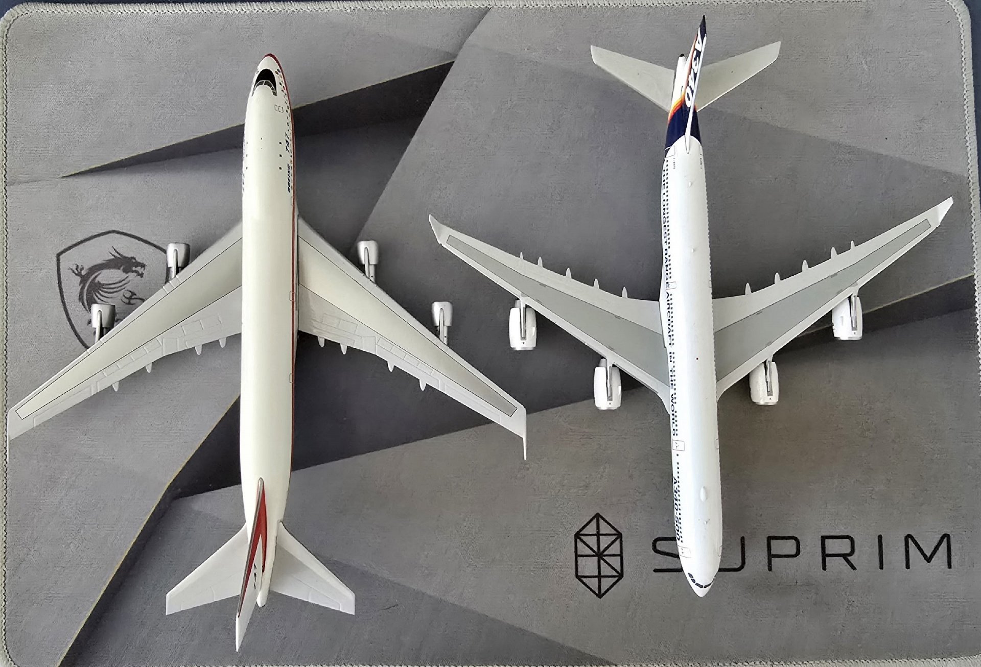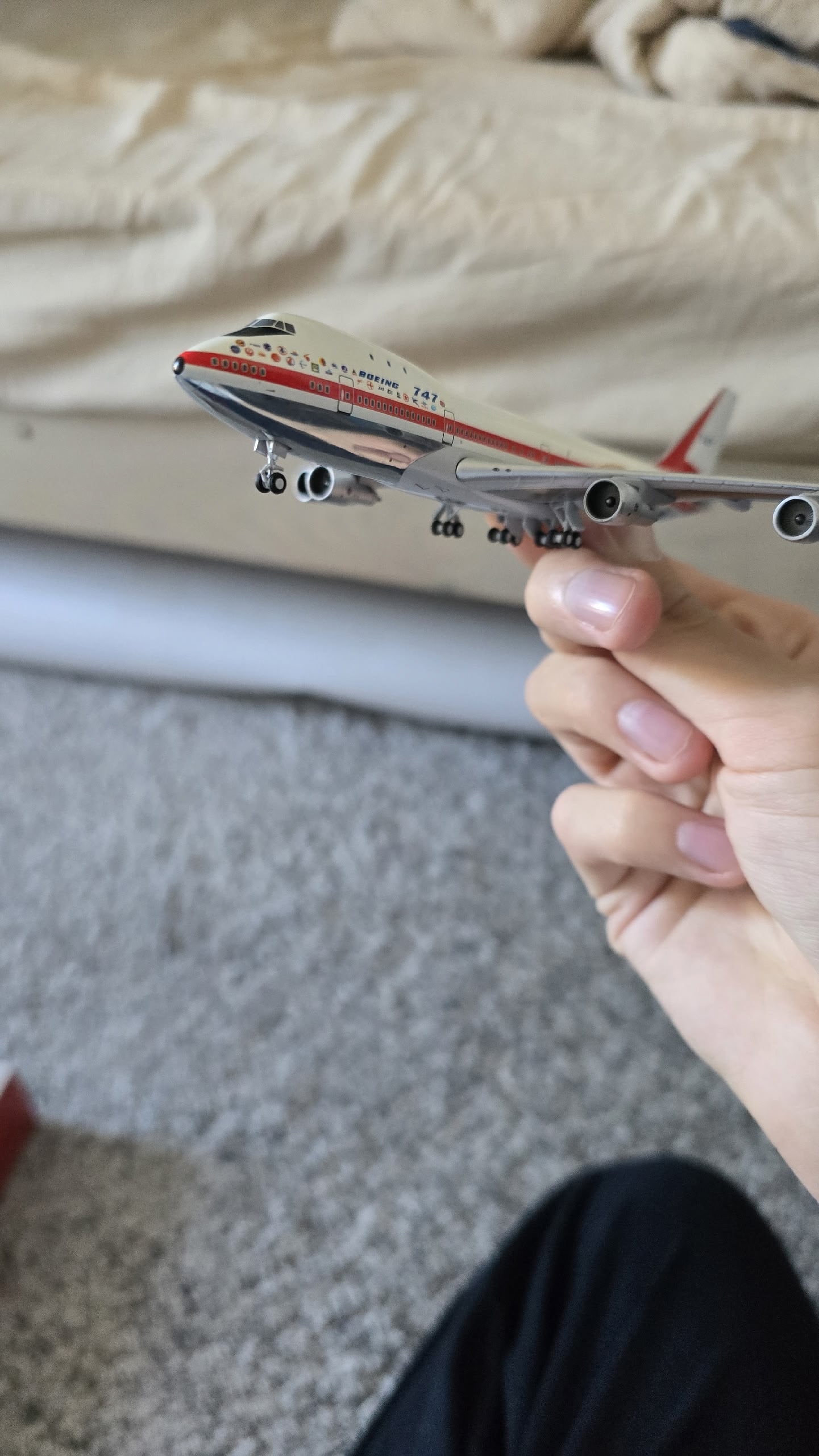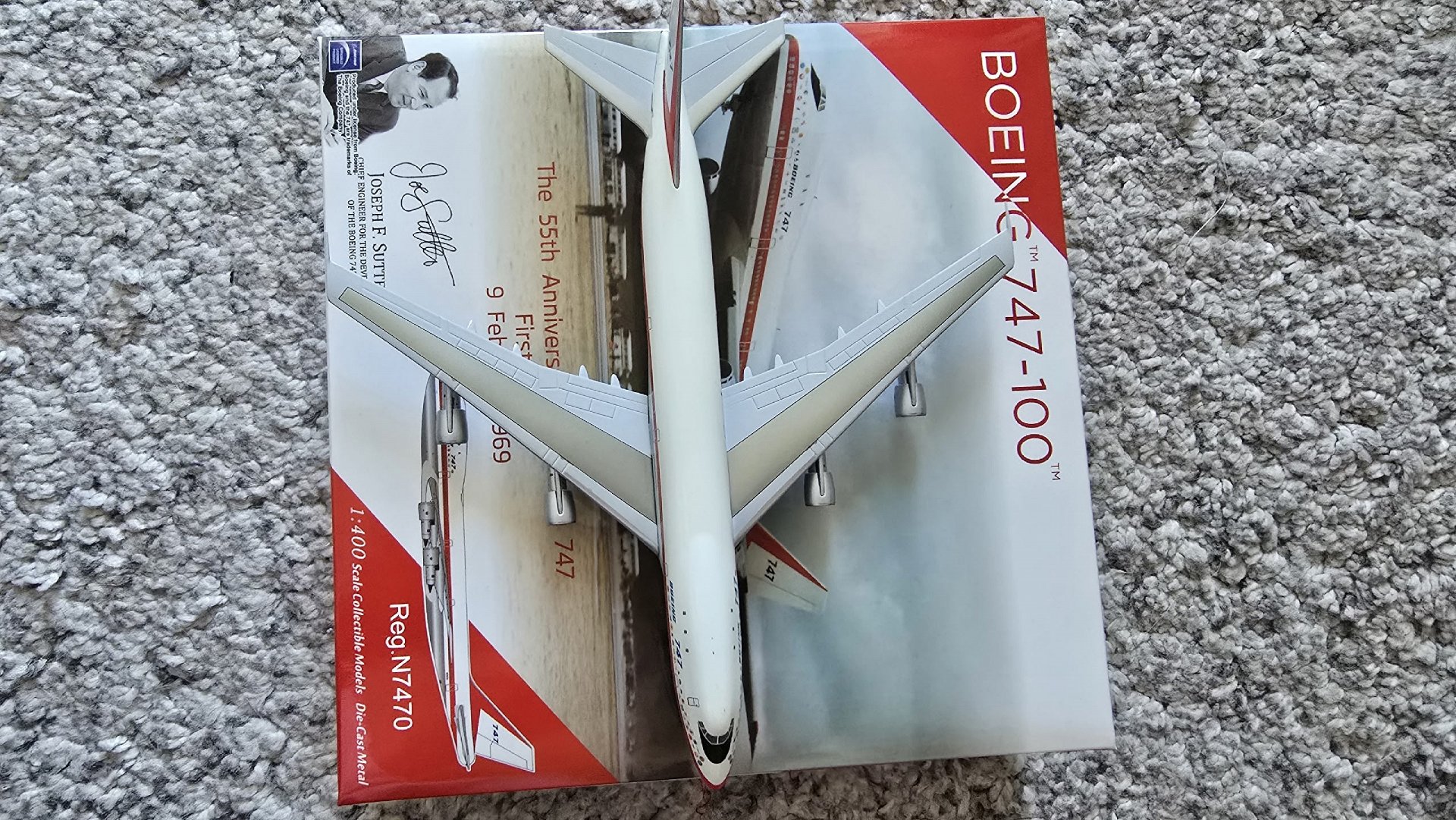 Сегодня я покажу вам более подробно и детально модель первого летного экземпляра боинг 747-100, совершившего первый полет 9 февраля 1969 года. Рассмотрим модель поподробнее. Производитель сделал красивую приятную глазу коробку, где на лицевой стороне нас встречает взмывающий в небо исполин Джамбо Джет, внутри коробки нас ждет прекрасно детализированная модель, сделанная из металла (кроме шасси, они резиновые), даже логотипы авиакомпаний-заказчиков на месте. Для сравнения размеров, разместил рядом с Airbus A-340-500. Покупкой доволен и вам советую, если вы любите классику и хотите прикоснуться к авиационным легендам. Надеюсь, обзор вам понравился.