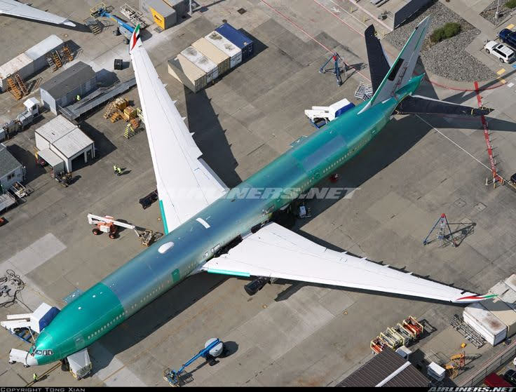 Увеличение размаха крыла автоматически переводило -9 в категорию F(ICAO), что делало невозможным его прием большинством аэропортов, обслуживающих -300ER. Чтобы сохранить его в категории E (размах крыла не должен превышать 65 метров) производитель решил вернуться к схеме со складывающимся после приземления крылом, которая рассматривалась ещё на заре создания 777 в конце 80-х, только тогда размер складывающихся частей был более масштабным. В результате чего крыло получило две отклоняемые вверх законцовки по 3,15 метра и размах крыла на стоянке составил 64,85 метра. Благодаря лёгкому композитному крылу, несмотря на увеличение длины фюзеляжа и коммерческой загрузки взлетный вес самолёта остался практически прежним: 351534 кг.