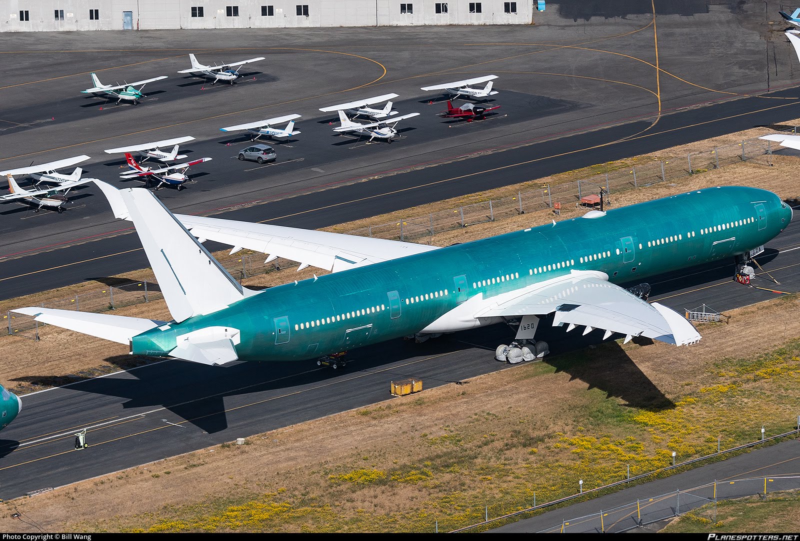Из за задержек, вызванных поздними поставками GE9X и недостатками, выявленными в ходе наземных испытаний, а также проблемы с фюзеляжем на статических испытаниях задержали первый испытательный полет, который состоялся лишь 25 января 2020 года.