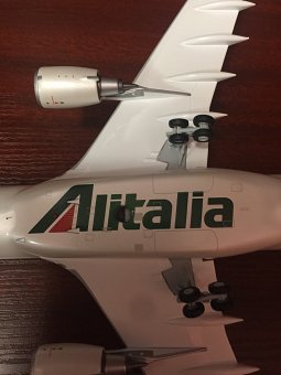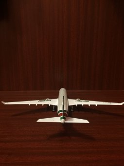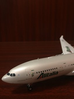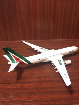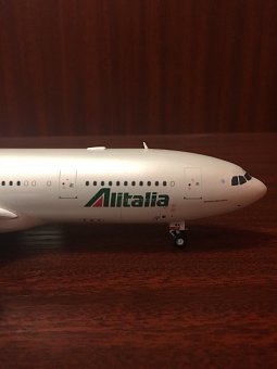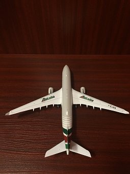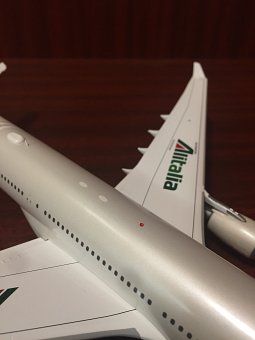 Модель представляет собой копию самолета Airbus A330-200 авиакомпании "Alitalia", изготовленную в металле в масштабе 1:200. Размеры: длина – 295 мм, размах крыла – 302 мм. Так что же вызвало желание сделать фотообзор данной модели?..
