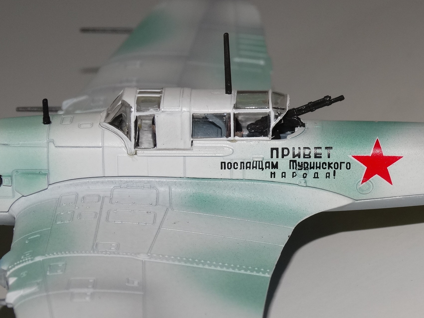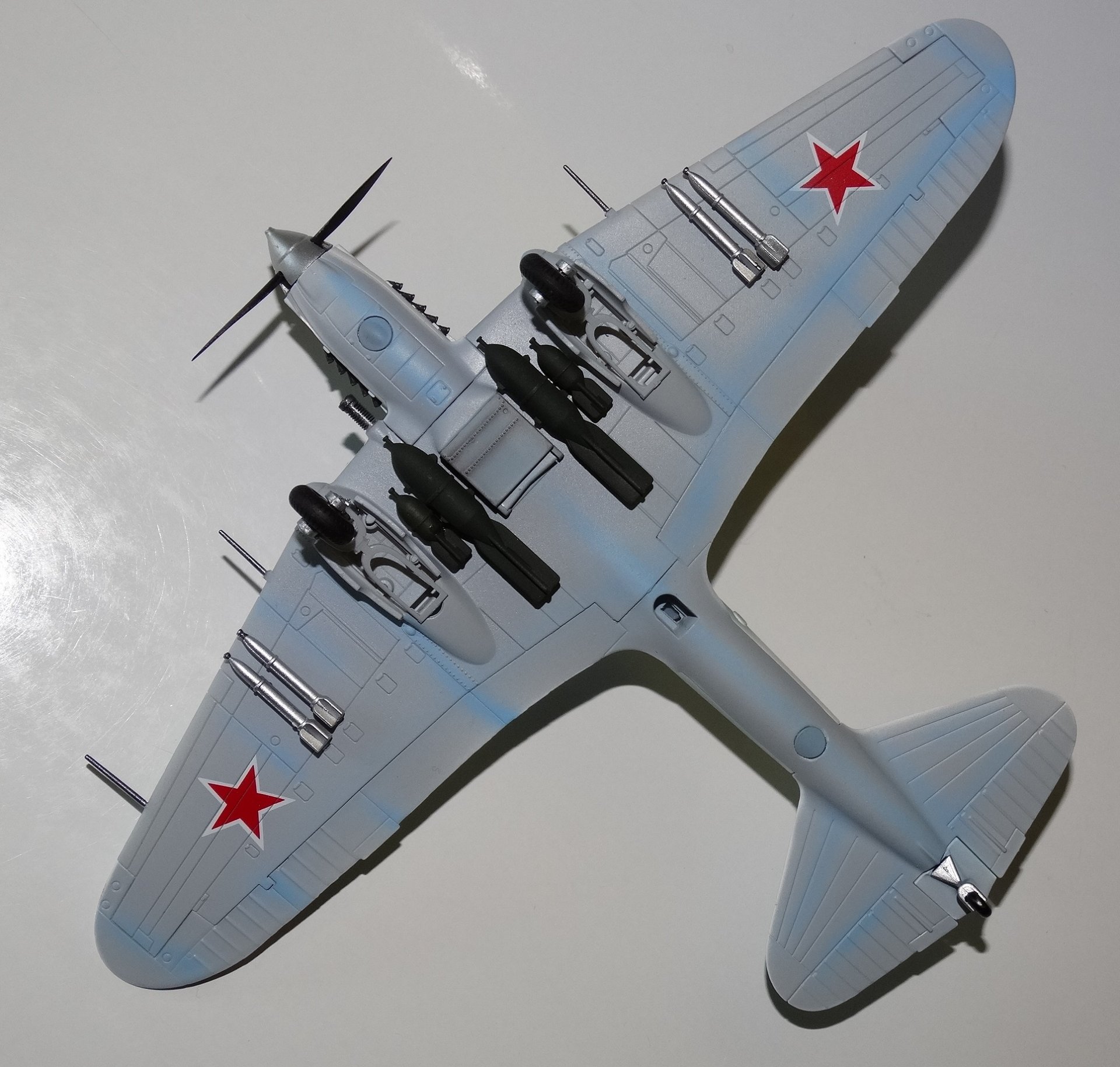 Как видно из вышеприведенных фотографий, у модели неплохая детализация, хорошо выполнена расшивка, достаточно хорошо выполнен пулемет стрелка-радиста, чем не может похвастаться модель Ил-2 от "Easy model", немного смущают стыки плоскостей с фезюляжем, но это совсем не критично.
