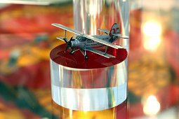 Рядом с макетом аэропорта стеллаж в форме фюзеляжа самолета, на полках которого выставлены новинки.