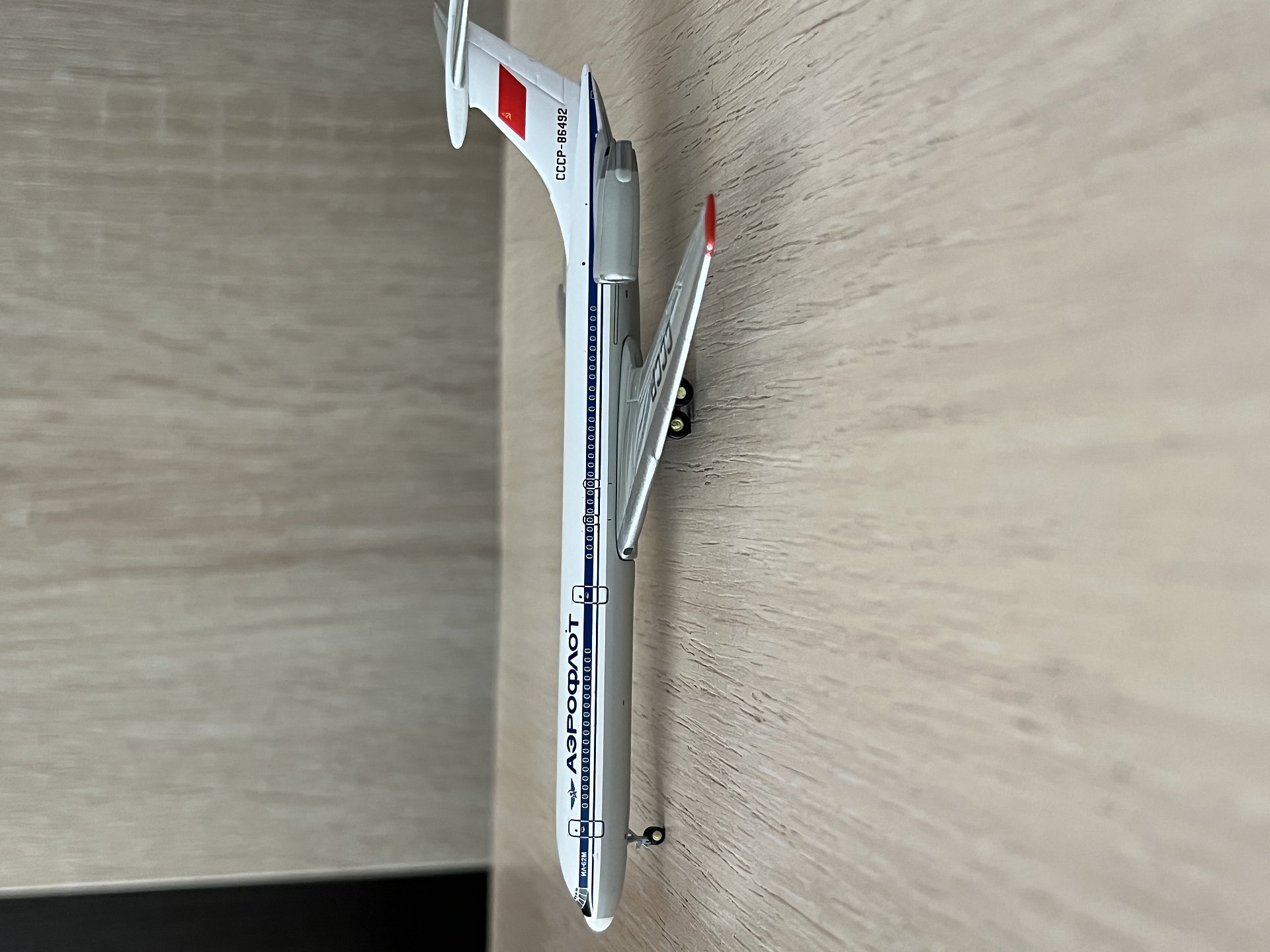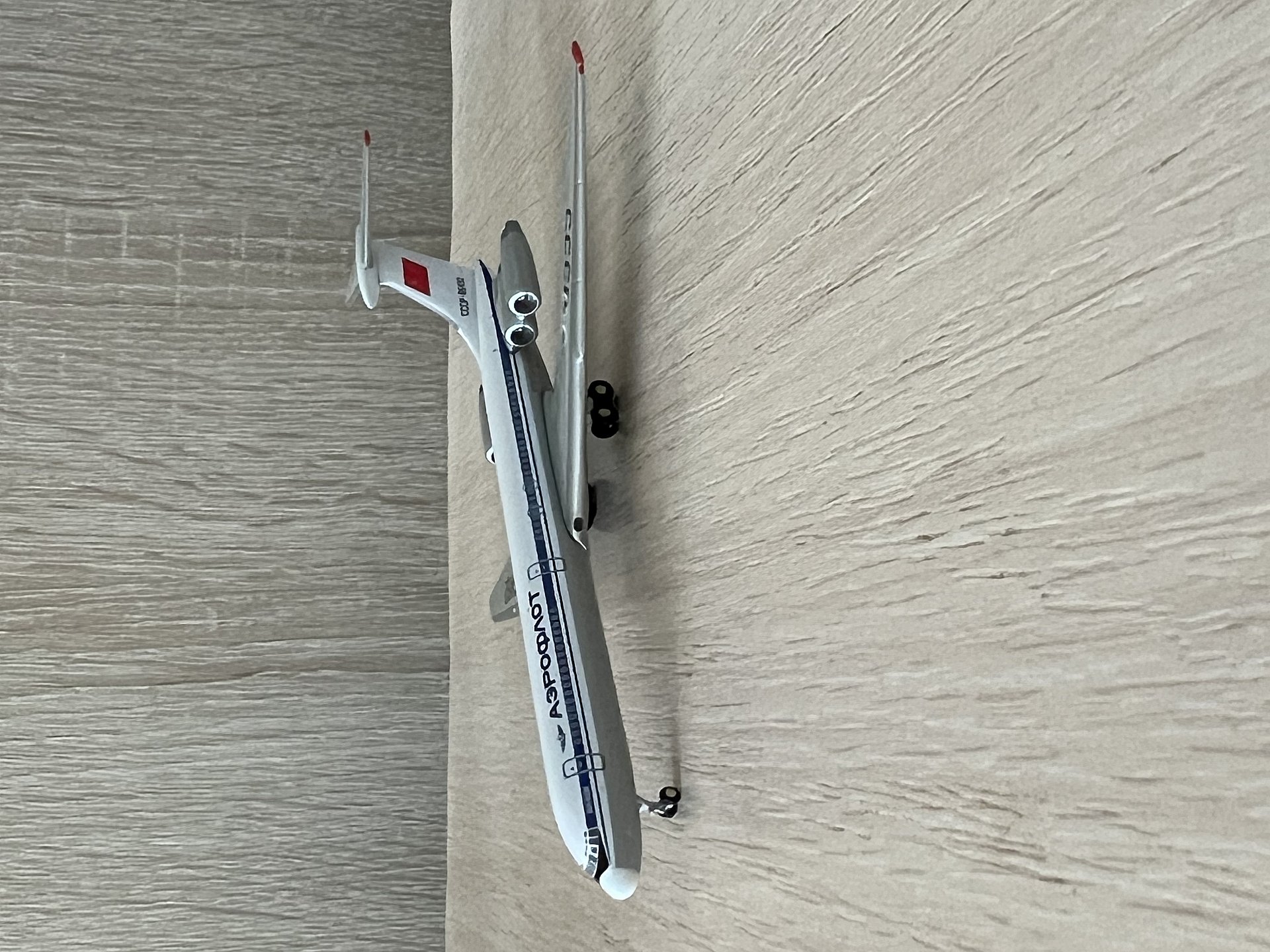 Абсолютно реалистичная модель самолета Ильюшин Ил-62М в ливреи авиакомпании Аэрофлот в окрасе 1980-х гг. и масштабе 1:400. Борт номерован СССР-86492, к слову, его оригинальная модель является памятником и стоит в аэропорту Шереметьево. Данная модель станет жемчужиной коллекции любого авиалюбителя, является полностью готовой, оснащена детализированными двигателями в хвостовой части, шасси с крутящимся колесами с резиновыми покрышками. Особую эстетику модели придает ретро раскрас представляющий собой белый фюзеляж с горизонтальными синими полосами в стиле Аэрофлот, крылья и двигатели модели окрашены в серебристый цвет, на крыльях с обеих сторон есть надписи:СССР и 86492, чередующиеся на верхней и нижней поверхности с обеих сторон. Хвост самолета достаточно необычный, на его пике будто размещен еще один маленький самолетик.