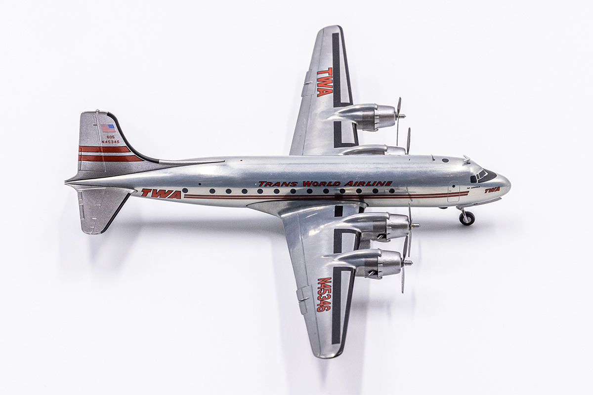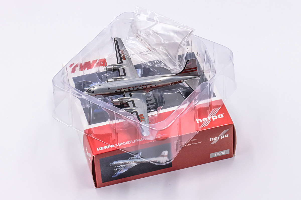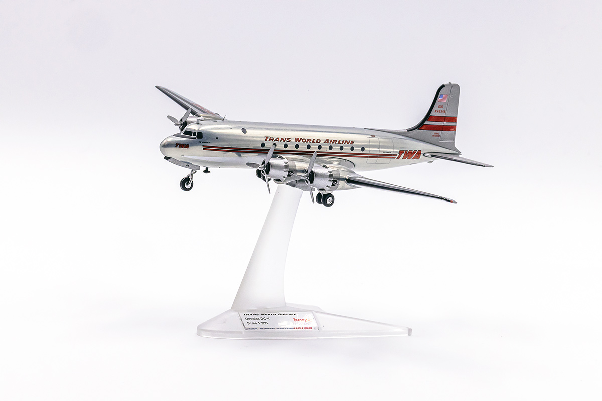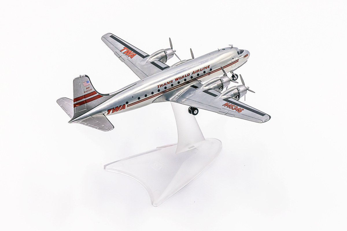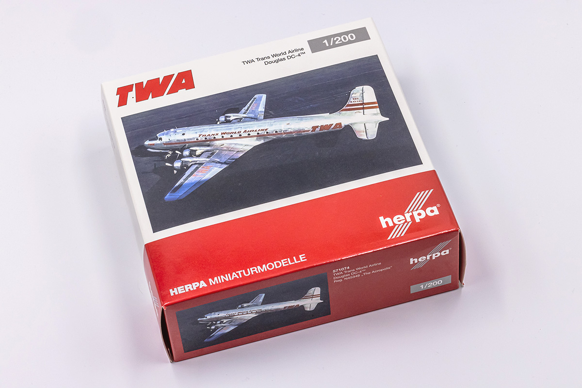 Авиалайнеры DC-4 авиакомпания TWA получила сразу же после окончания Второй мировой войны и использовала их, в основном, на африканском маршруте из Нью-Йорка в Каир. "Херпа" выбрала для своей модели ливрею TWA 1940-50х гг.