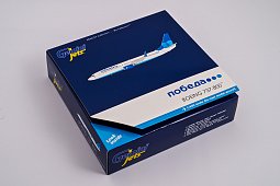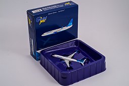Упаковка стандартная для всех моделей производства GeminiJets - их плотного глянцевого картона в темно-синем цвете. На коробку нанесен профиль самолета, логотипы производителя модели и авиакомпании, а также название самолета.
