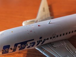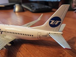 Данный борт с серийным номером 27331 был построен в сентябре 1994 г. и сразу же пополнил флот американской компании Continental, где и летал до октября 2008 г. Недолгое время находился на хранении, получил винглеты, и в феврале 2009 г. пополнил парк ЮТэйр, где благополучно и летает до сих пор. Всего лишь вторая модель самолетов ЮТэйр в 200-м масштабе: первой моделью был вертолет Ми-8 в "попугайской" раскраске, потом Ту-154М, и теперь этот 737-ой.