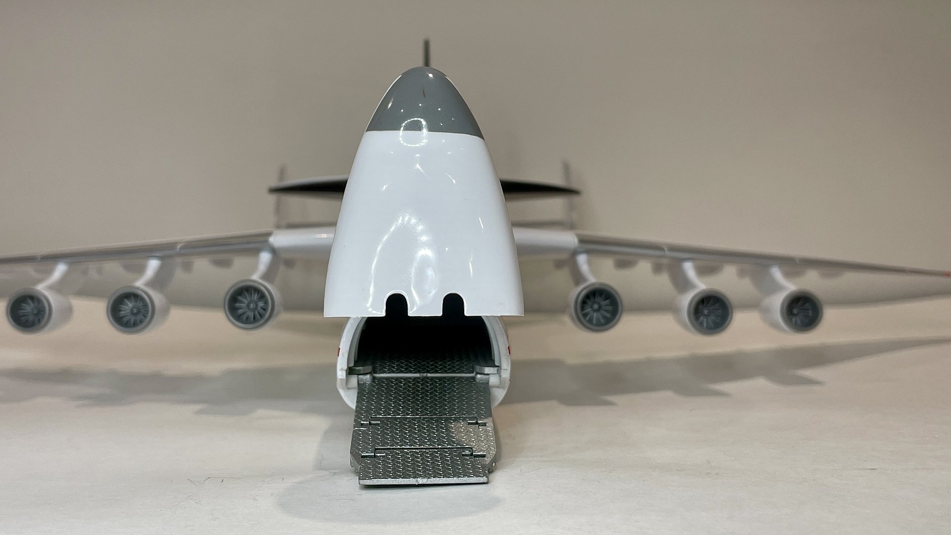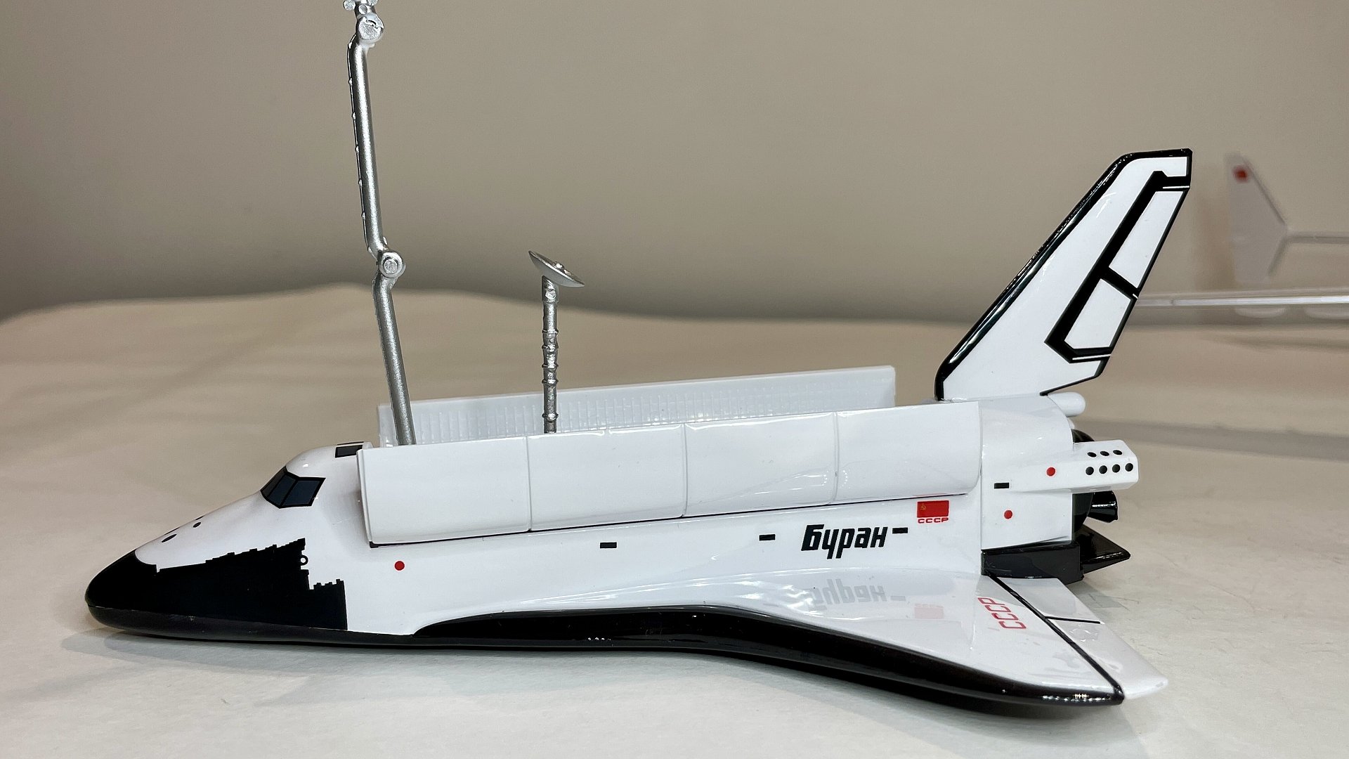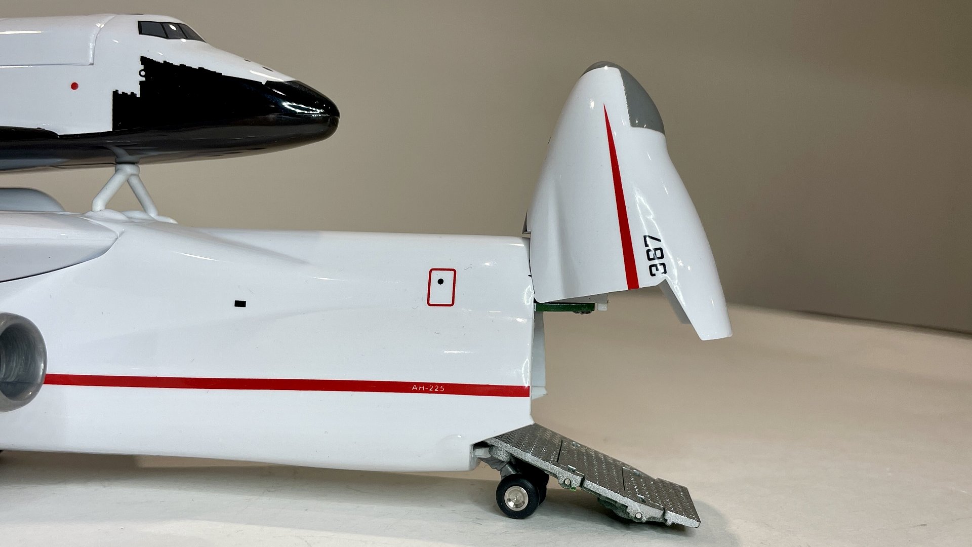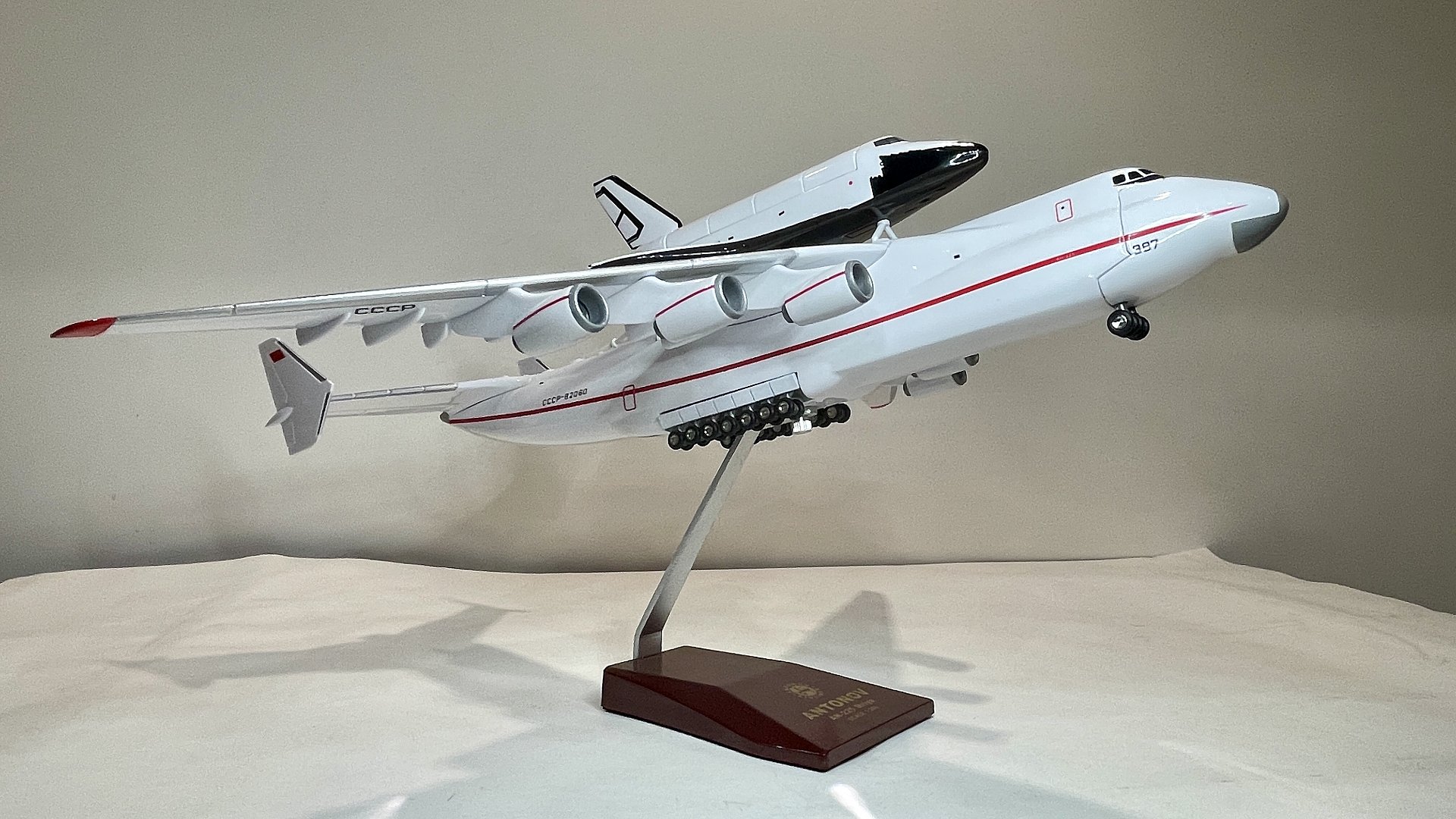 Представляю вашему вниманию обзор модели советского самолёта Ан-225 «Мария» с космическим челноком “Буран». За основу модели был взят первый и единственный летающий образец с бортовым номером СССР-82060, после распада СССР перешёл в собственность Украины и получил бортовой номер UR-82060. Второй экземпляр не достроен. ПО известным обстоятельствам единственный лётный экземпляр разрушен в ангаре 25 февраля 2022 года в боях за аэропорт «Антонов» в ходе боев России против Украины. Сообщается, что Антонов начал строить новую "Мрию", в том числе из обломков старого самолета. До последнего времени самолет являлся самым большим в мире и имел 106 мировых рекорда. Первый полет состоялся 21 декабря 1988 года.
