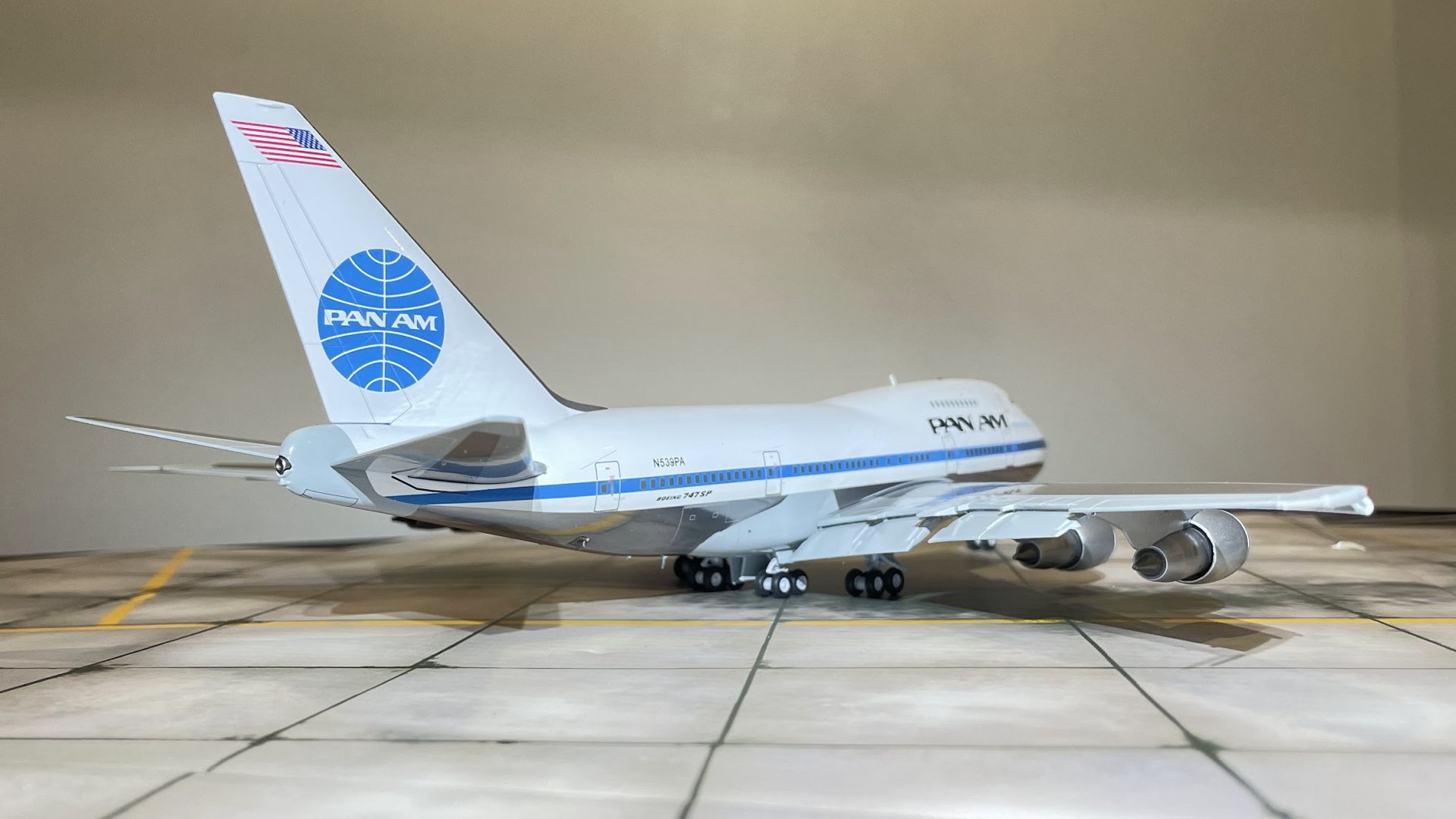 Данная модель представлена в ливрее авиакомпании PAN AM c бортовым номером N539PA. Изучив историю этого самолета, стало ясно, что произведен он был в марте 1979 года, как 22 й выпущенный Боингом вариант SP.