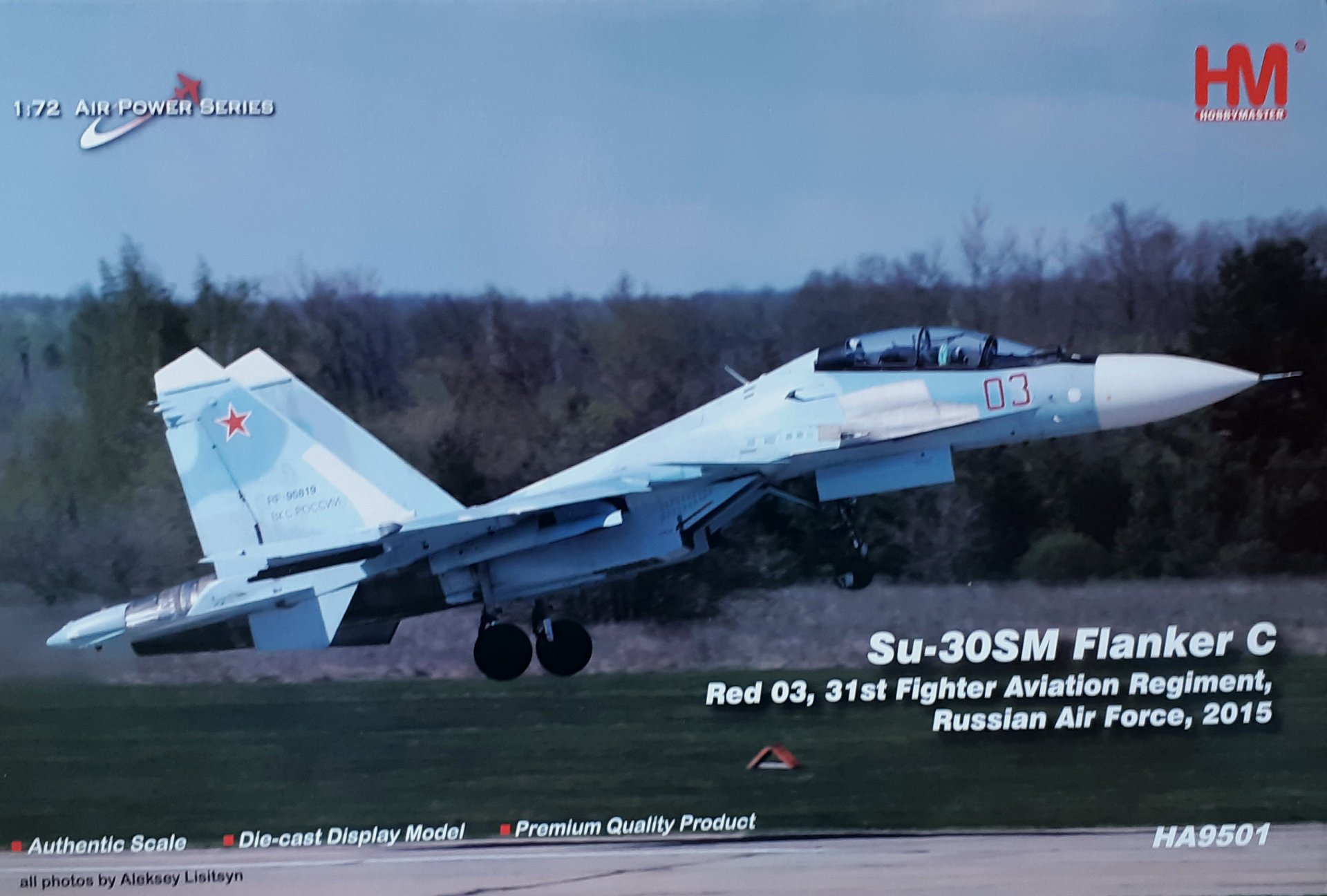Модель истребителя Су-30СМ ВКС России (поколения 4+) от производителя Hobby Master, в масштабе 1:72, артикул: HA9501, с номером 03, RF-95819, из 31-го истребительного авиаполка, дислоцированного на аэродроме Миллерово, Ростовская область. Данный борт также принимал участие в военной операции в Сирии, аэродром Хмеймим в 2015 году.