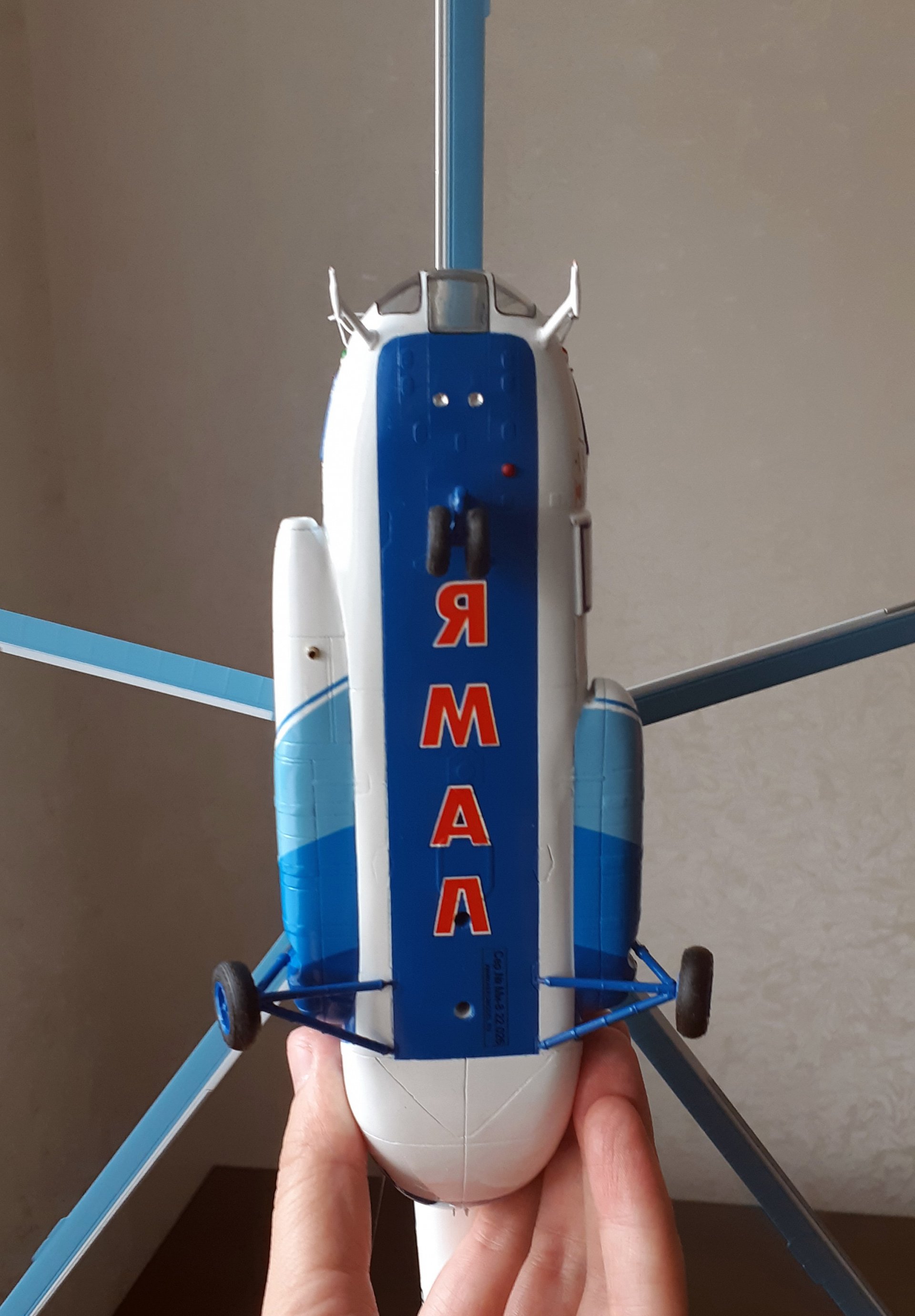 Вид снизу. Хорошо видны нижний проблесковый маяк, посадоч-поисковые фары ФПП-7М, выхлопной патрубок на керосиновом обогревателе КО-50 (слева). В районе основных стоек отверстия для крепления к подставке. Рулежная фара на модели как и на прототипе отсутствует.