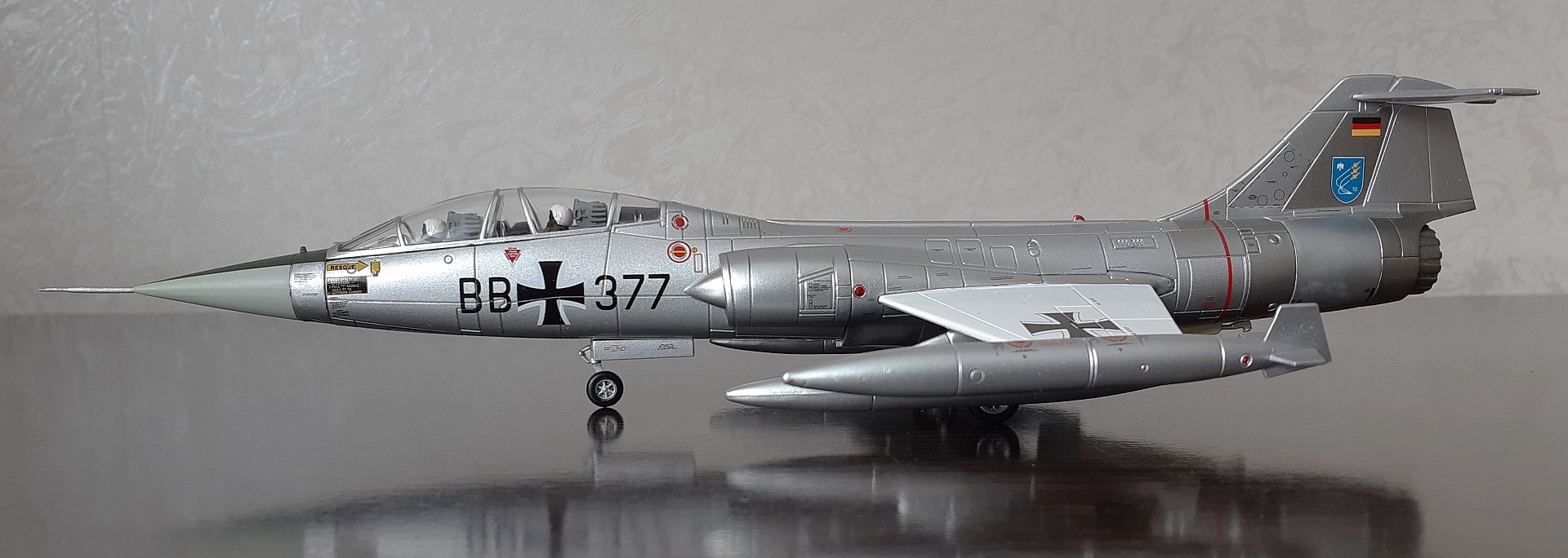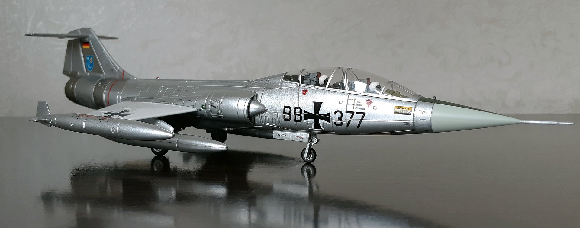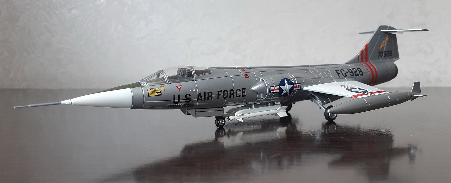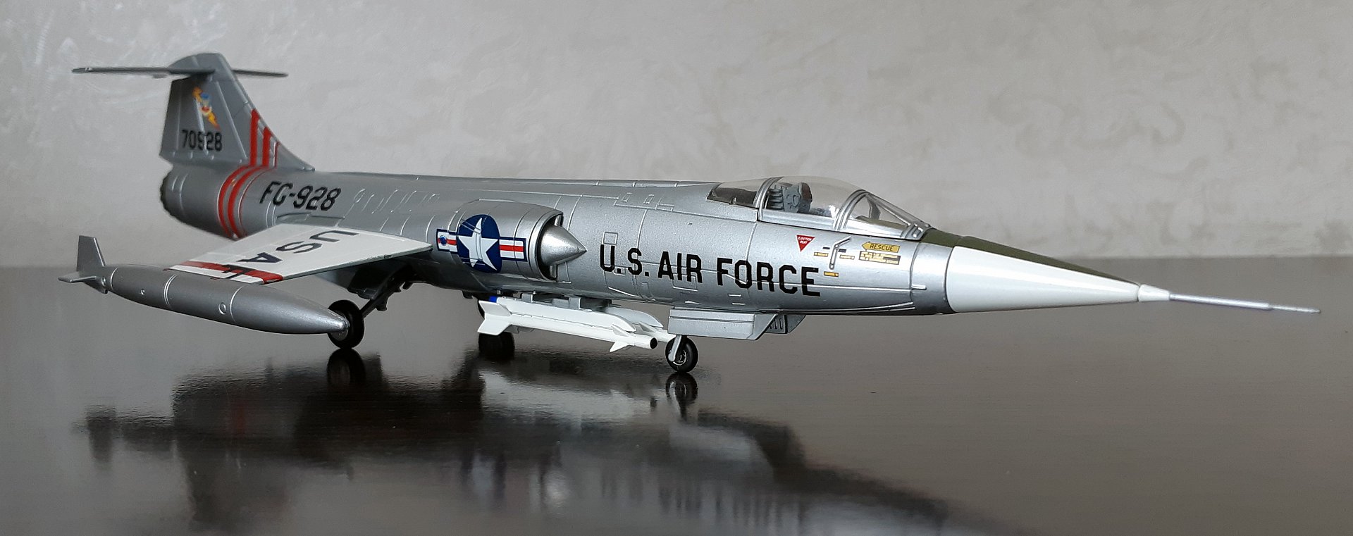 Модели сами по себе показались интересными своей необычной стреловидной конструкцией. Теперь немного об особенностях: пресс-формы обеих моделей хоть и выглядят одинаково, но немного отличаются. На «американце» от Corgi в комплекте отсутствует фигурка пилота, ПВД снимается; на «немце» от Hobby master ПВД не съемное, кабина – тандемная спарка, на самолете полностью отсутствует какое-либо вооружение включая пушку «Вулкан», в остальном модели практически идентичны. В комплекте к моделям идут подставки. Особое внимание на «немце» привлекает обилие различных тех. надписей и маркировок, пожалуй, это единственная модель F-104 от Hobby master, из всех выпускавшихся, которая может порадовать такой проработкой, чего конечно не скажешь о «американце». На нем пришлось тоже немного «поколдовать», покрасил заливные горловины крыльевых и основного топливных баков, прорисовал БАНО, проблесковый маяк, доклеил надписи USAF на правом (сверху) и левом (снизу) плоскостях, т.к. изначально на модели их не было. Дальше собственно фотографии.