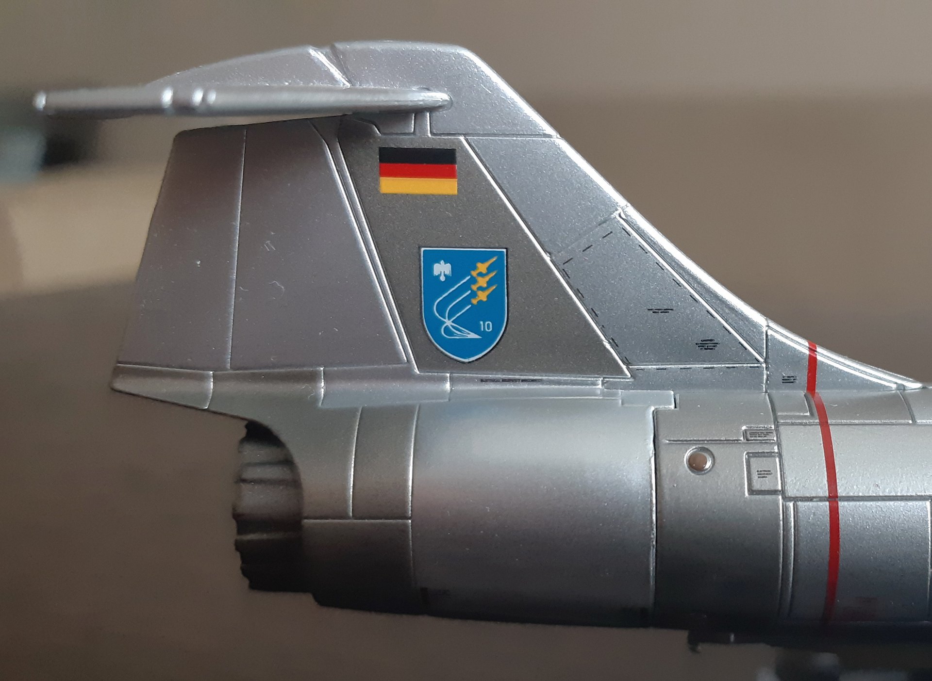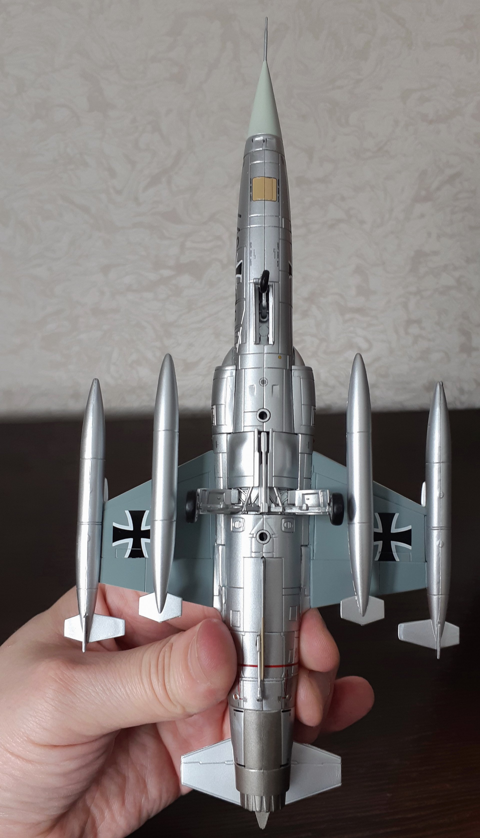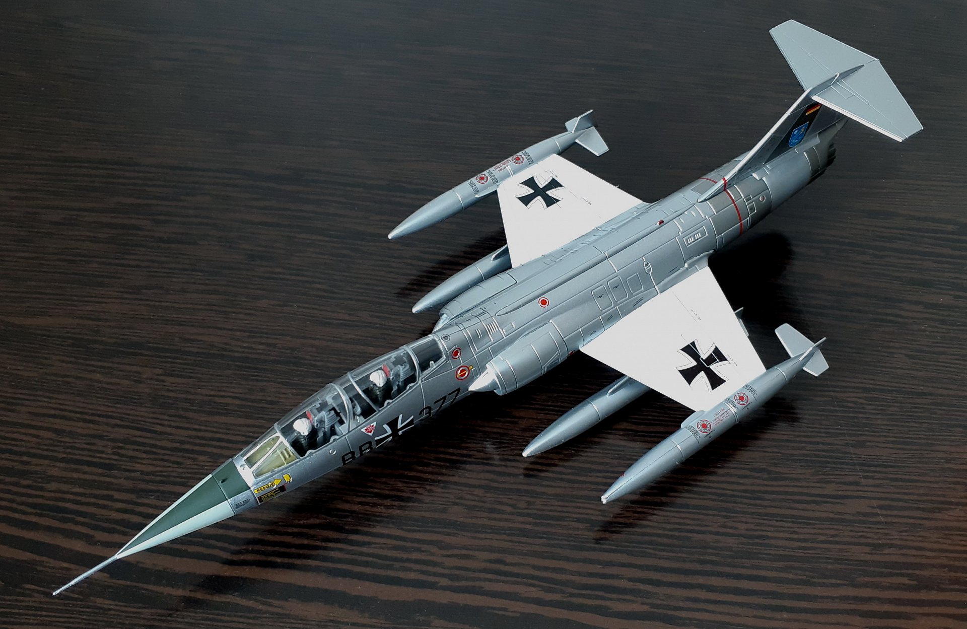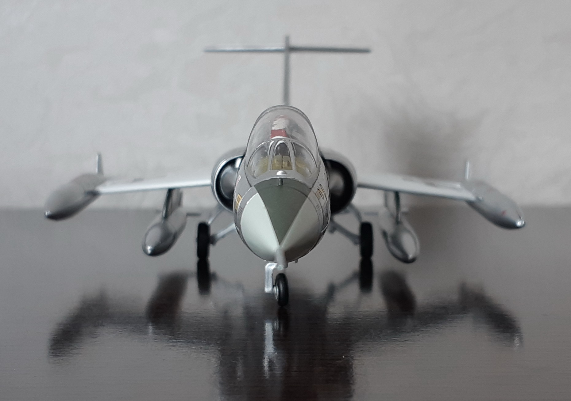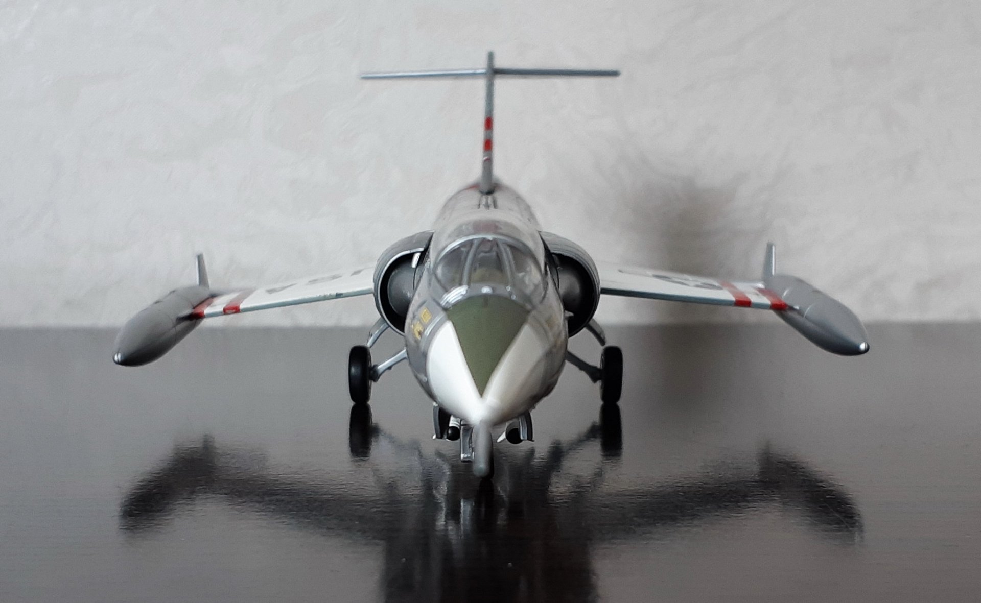 Модели сами по себе показались интересными своей необычной стреловидной конструкцией. Теперь немного об особенностях: пресс-формы обеих моделей хоть и выглядят одинаково, но немного отличаются. На «американце» от Corgi в комплекте отсутствует фигурка пилота, ПВД снимается; на «немце» от Hobby master ПВД не съемное, кабина – тандемная спарка, на самолете полностью отсутствует какое-либо вооружение включая пушку «Вулкан», в остальном модели практически идентичны. В комплекте к моделям идут подставки. Особое внимание на «немце» привлекает обилие различных тех. надписей и маркировок, пожалуй, это единственная модель F-104 от Hobby master, из всех выпускавшихся, которая может порадовать такой проработкой, чего конечно не скажешь о «американце». На нем пришлось тоже немного «поколдовать», покрасил заливные горловины крыльевых и основного топливных баков, прорисовал БАНО, проблесковый маяк, доклеил надписи USAF на правом (сверху) и левом (снизу) плоскостях, т.к. изначально на модели их не было. Дальше собственно фотографии.
