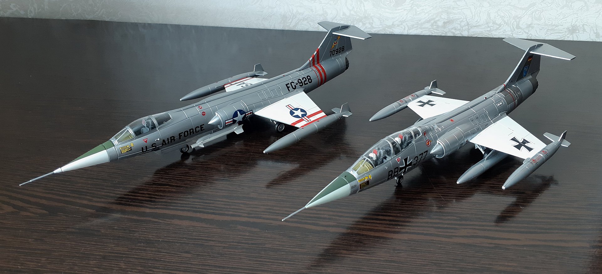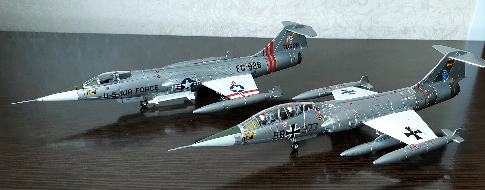 Доброго времени суток дорогие друзья! Сегодня хочу представить сравнительный обзор истребителей-перехватчиков Lockheed «Starfighter» F-104C U.S. Air force из 479 крыла тактических истребителей, авиабаза ВВС США Удорн, Тайланд, 1964 г. и F-104F Luftwaffe, истребительной школы ВВС Германии, от производителей Corgi и Hobby Master соответственно.