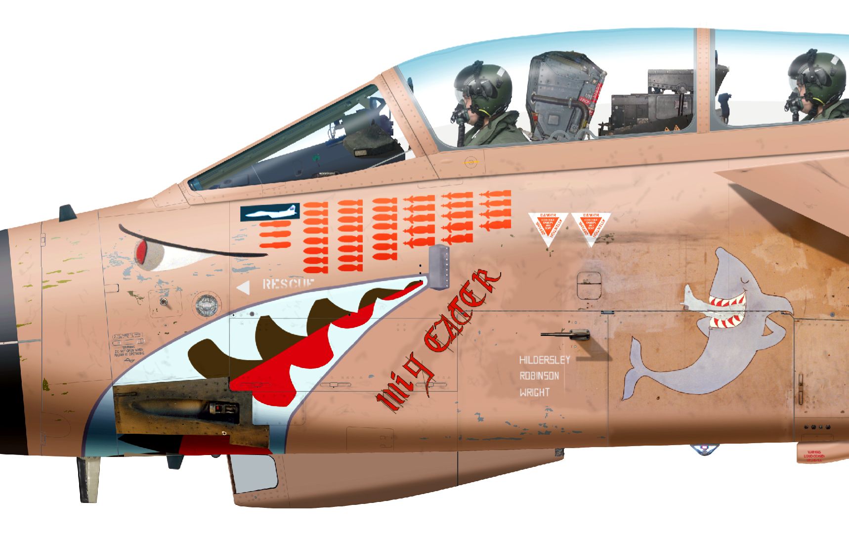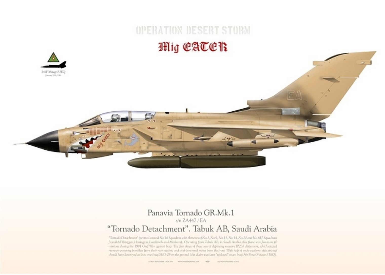 Во время одного из вылетов по нанесению удара по аэродрому в Ираке, ZA447/EA уничтожил самолет, который, как предполагалось, был МиГ-29, поэтому на носу самолета появилась надпись: MIG EATER «Пожиратель мигов». Позже выяснилось, что на самом деле это был Иракский «Мираж» F.1.