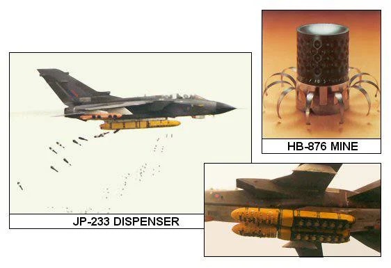 Из вооружения, помимо ракет, на данной модели расположены два подвесных кассетных контейнера JP-233 Dispenser, предназначавшиеся в основном для уничтожения аэродромов и минирования местности. Подробно их описывать не стану, если интересно, в интернете о них полно подробной информации. Из найденного такая вот картинка, о том как это работает.