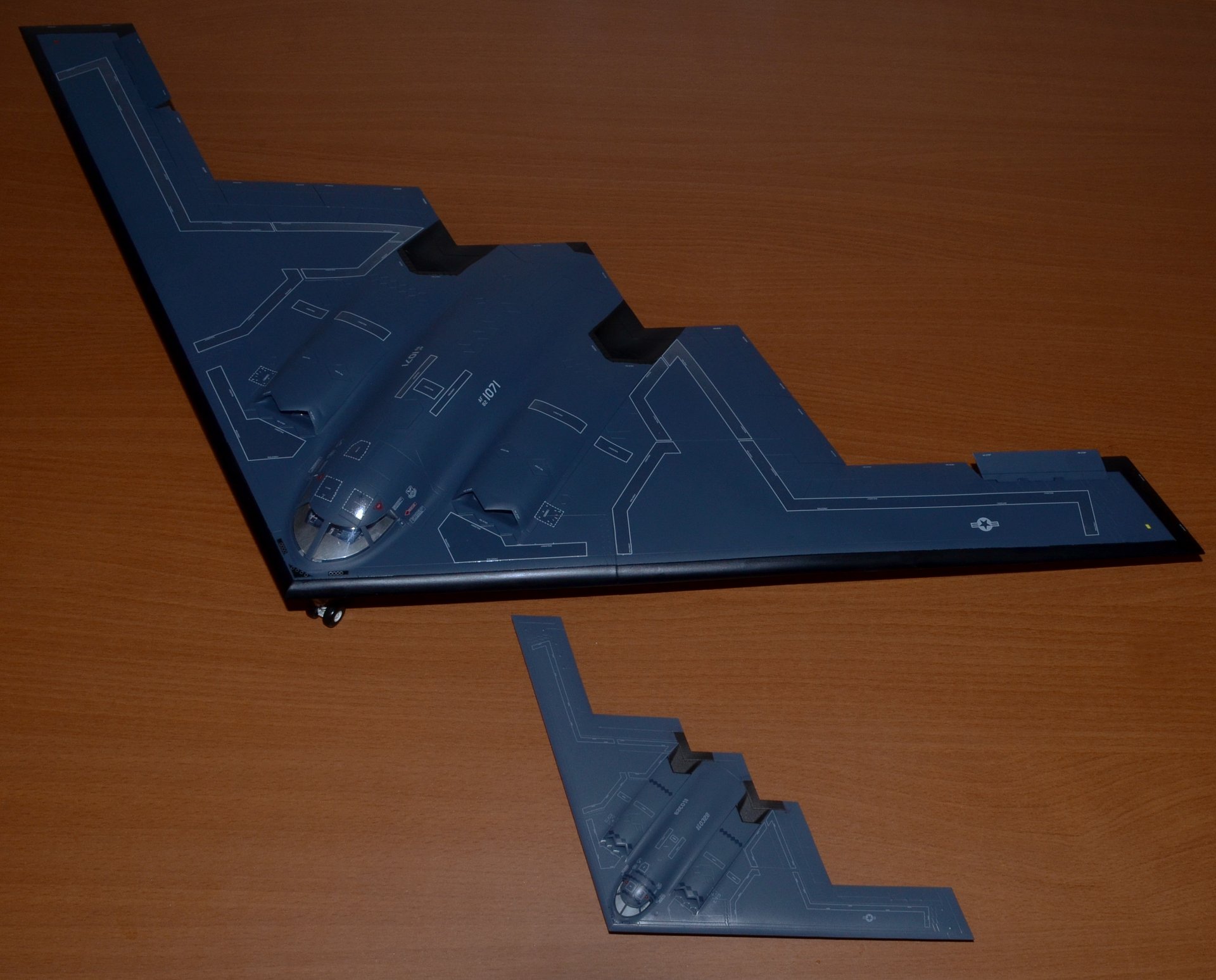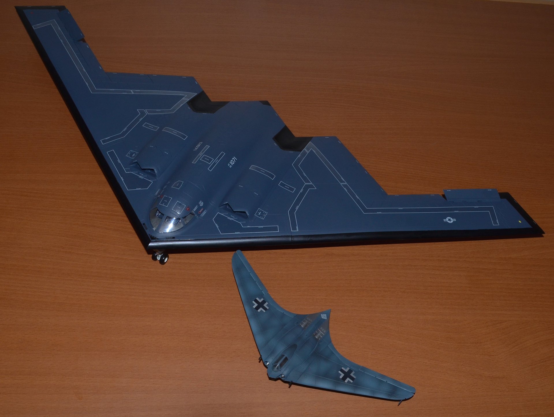 Прародитель, немецкий Horten Gotha Go 229, захваченный американцами в конце 1945 года на заводе во Фридрихсроде, который в последствии послужил созданию Northrop Grumman B-2 Spirit. (Обе модели в масштабе 1:72 для сравнения)