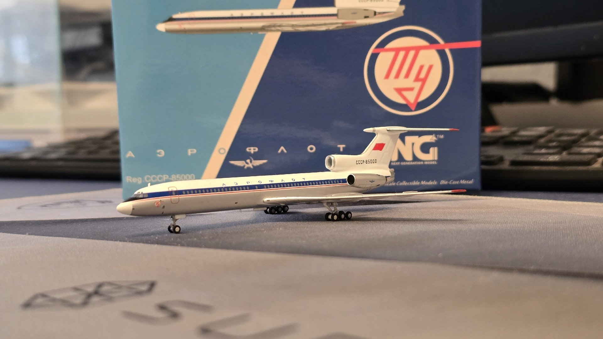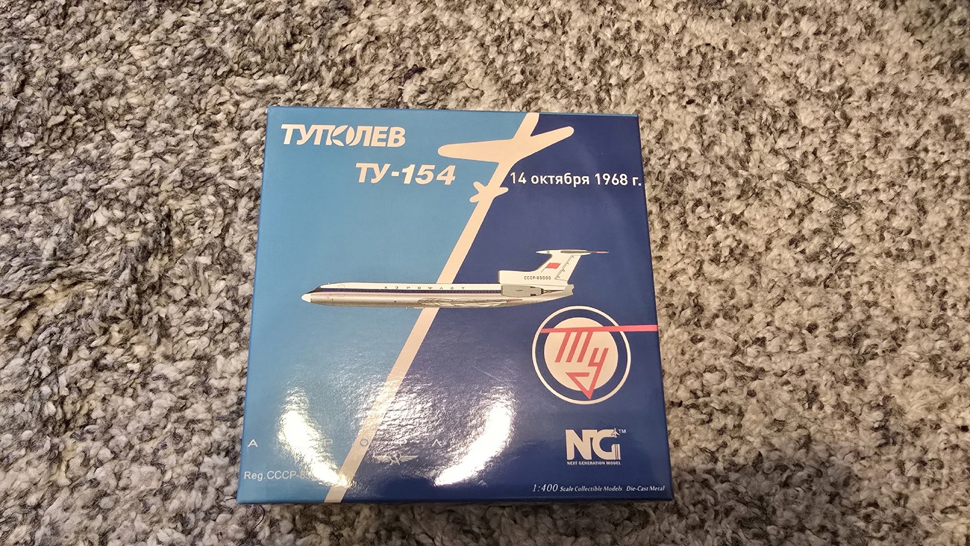 Сегодня я покажу вам и нашу легендарную машину. Туполев Ту-154. Это первый опытный самолет, совершивший свой первый полет 3 октября 1968 года. Модель выполнена в масштабе 1:400 производителем NG Model, металлическая, с резиновыми крутящимися покрышками у шасси. Очень хорошо выполнена коробка, на которой изображена первая опытная машина, но почему-то написана дата 14 октября. Детализация на высоком уровне, однако, отмечу огрехи в виде не совсем правильной имитации остекления кабины пилотов и отсутствия прорисовки маленьких аварийных выходов (а они были). В остальном, модель мне понравилась, одна из лучших по этому самолету.
